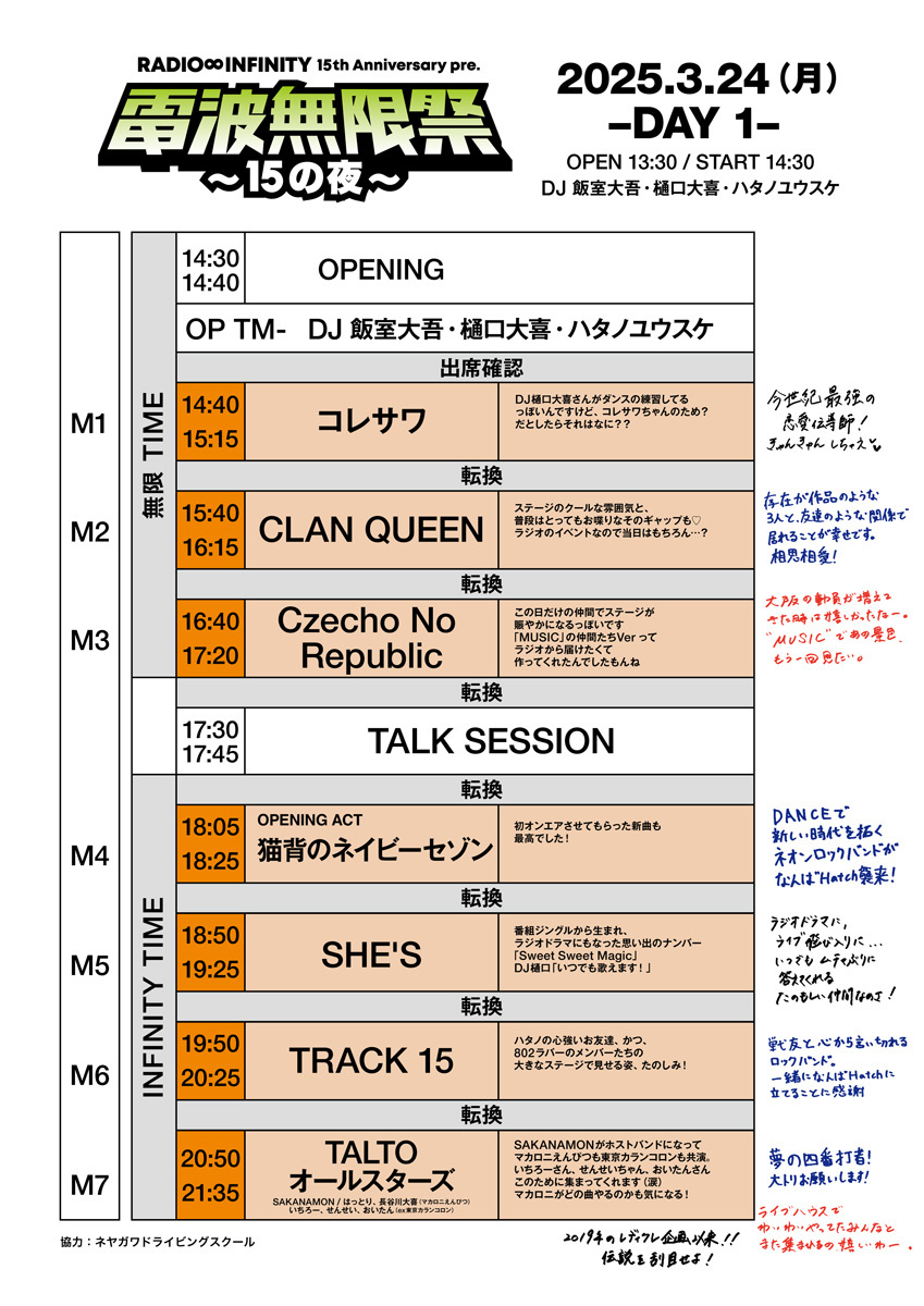 2025年3月24日(月)、25日(火)に大阪・なんばHatchにて開催される『RADIO∞INFINITY 15th Anniversary pre. 電波無限祭-15の夜-』のタイムテーブルが発表された。
