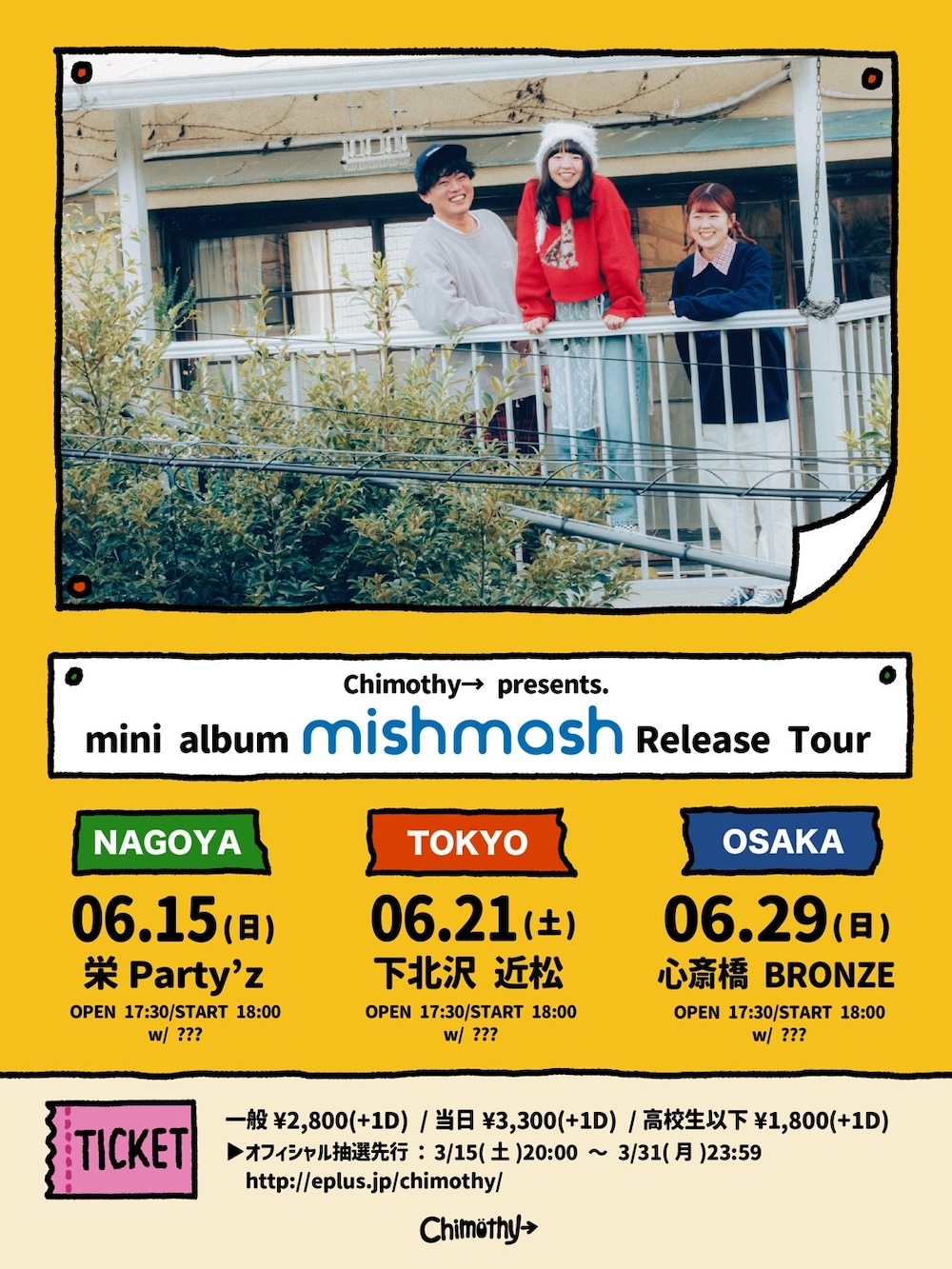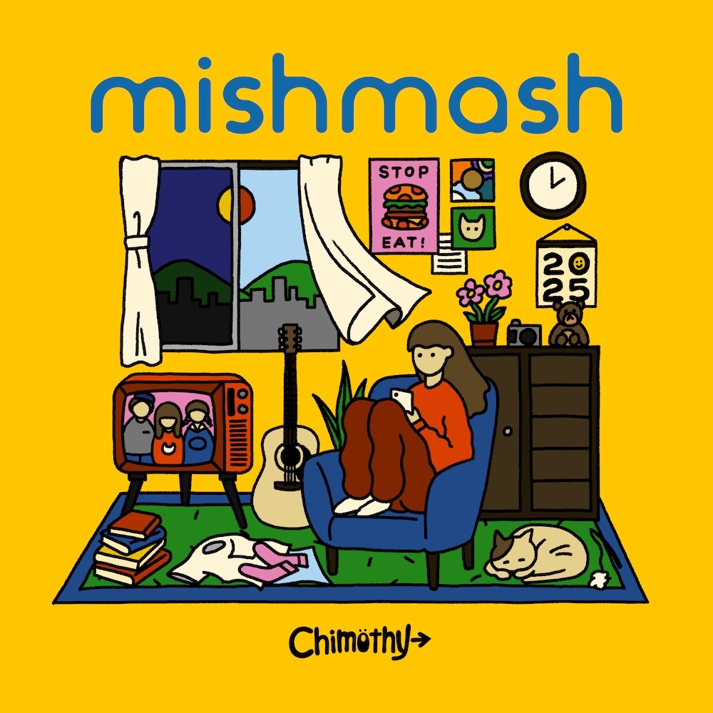 今年の1月にmurffin discsへの所属が発表されたChimothy→(読み:チモシー)。そんな彼女たちが4月23日(水)にリリースするminiAL『mishmash』のアートワークが公開となった。今作も松尾あかり(Vo/Gt)がデザインを手がけており、彼女たちのポップな世界観が描かれている。