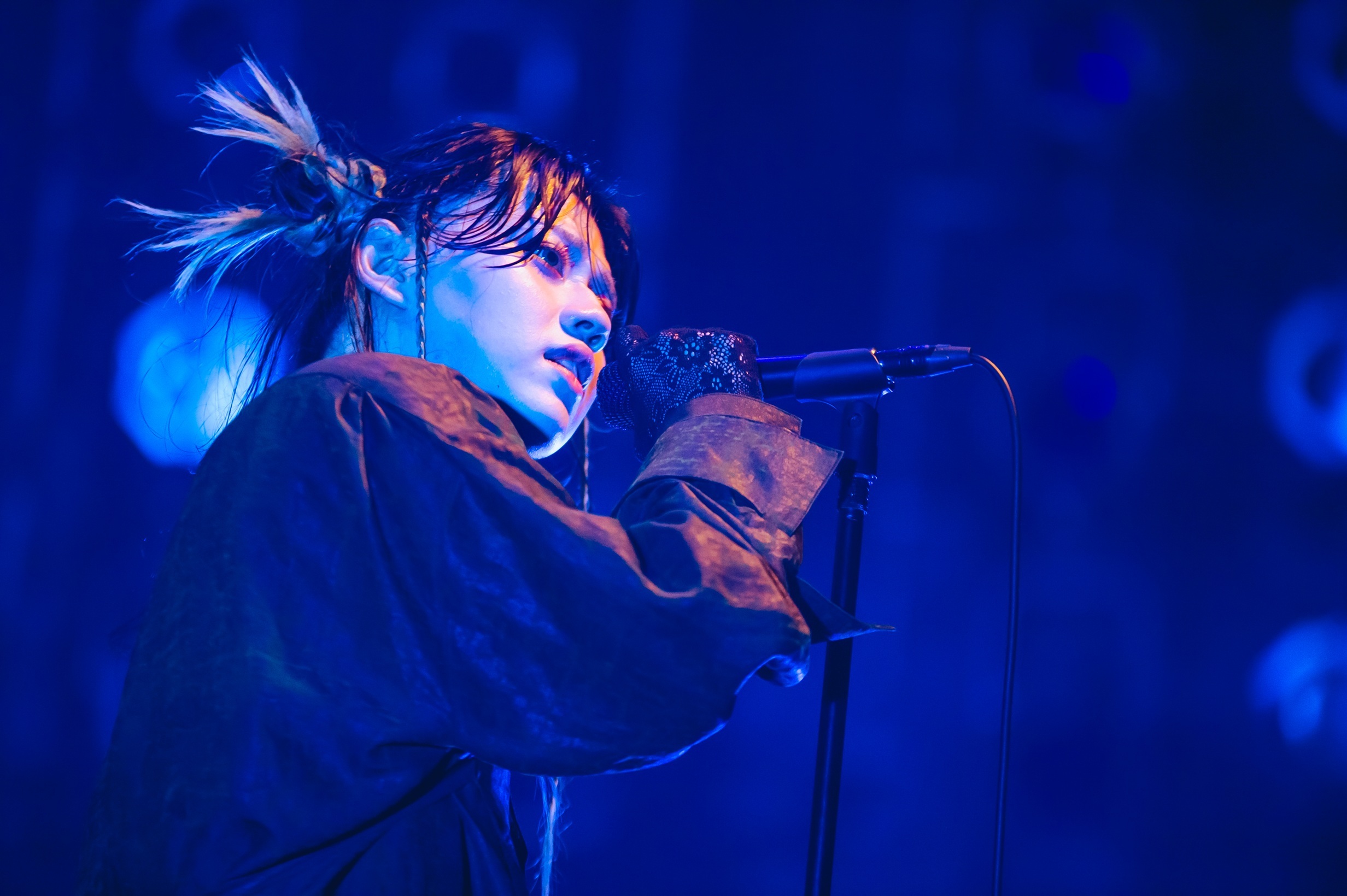 ソールドアウトを記録した東京公演は、開演前から満員のフロアが熱気に包まれている。そんな中、ライブのトップバッターとしてステージに登場したのがChevon。ヘヴィなビートのオープニングSEに乗せてサポートメンバーの小林令(Dr)が姿を現すと、続いてKtjm(Gt)、オオノタツヤ(Ba)、谷絹茉優(Vo)とメンバーが順番にステージに上がり、ライブはそのまま「ノックブーツ」からスタートする。ファンキーなバンドサウンドを前に、フロアの盛り上がりは一気に加速。続くアップテンポの「冥冥」では、谷絹の「今日のChevon は2曲目からフルスロットルですよ。ついてこれますか? おいしくるメロンパンまで体力残してんじゃねえぞ!」の煽りを受け会場の熱気はさらに上昇し、曲中のシンガロングとともに一体感を強めていく。さらに、昨年11月に発表されたばかりの最新曲「銃電中」ではKtjmの激しいギターソロも炸裂し、ライブは早くも佳境のような盛り上がりを見せた。