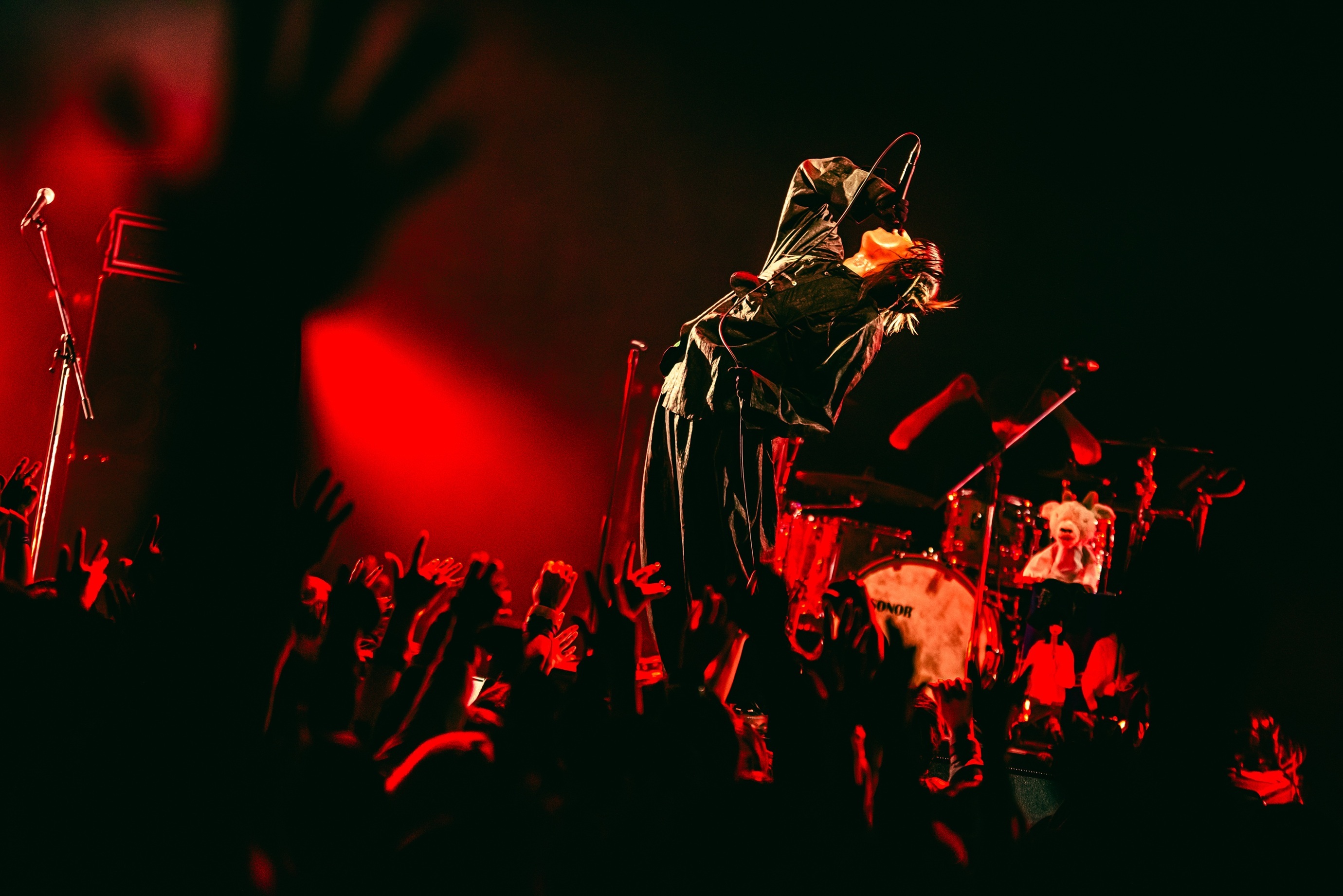 最初のMCでは谷絹が「メロンパンがパン派で、うちらがライス(派)なのかな? でも、そういうことでもないらしくて(笑)」と、ツアータイトル『▶️PAN or RICE…?』に触れる一幕も。続けて「思いっきり盛り上げて、先輩たちにバトンをつないで。あとは思いっきり観るだけ。先攻っていいですよね!」と口にすると、フロアからは笑いが起こる。そんな和やかな空気も、続くミドルヘヴィの「大行侵」で一変。オオノ&小林が繰り出すタイトなリズムに、谷絹はエネルギッシュなシャウトを重ねて唯一無二の空気を生み出していく。かと思えば、「Banquet」では谷絹がフロアに降りてオーディエンスを煽る場面も。「ダンス・デカダンス」ではタテノリのビートに合わせて観客がジャンプするなど、さまざまな表情を持つ楽曲たちでChevonらしいステージが繰り広げられていく。