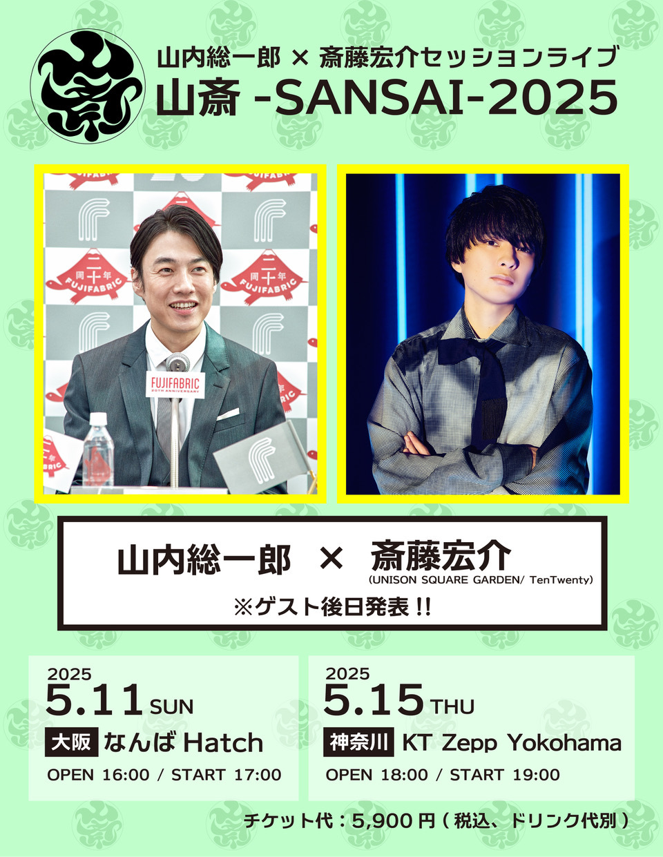 『山内総一郎×斎藤宏介セッションライブ 山斎-SANSAI- 2025』と題した今回のライブは、5月11日(日) 大阪・なんばHatch、5月15日(木)神奈川・KT Zepp Yokohamaの2公演を開催。各公演には、各公演ゲストアーティストの参加も決定している。なお、ゲストアーティストは後日発表となる。