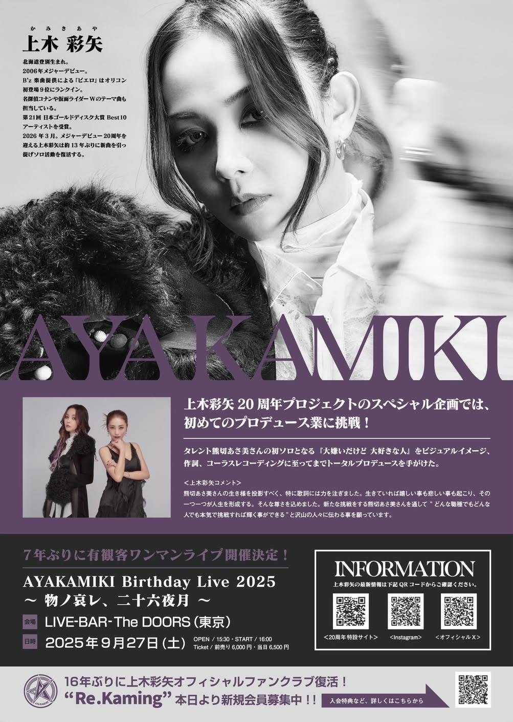 さらに、4月11日(金)12時より、”Re.Kaming”と名付けたオフィシャルファンクラブも発足する。ファンクラブ発足と同時に、9月のバースデーライブのファンクラブ先行を実施するとのことで、2026年3月にメジャーデビュー20周年というメモリアルイヤーを迎える上木彩矢が、いよいよ本格的にアーティスト活動を再開するので要チェックだ。