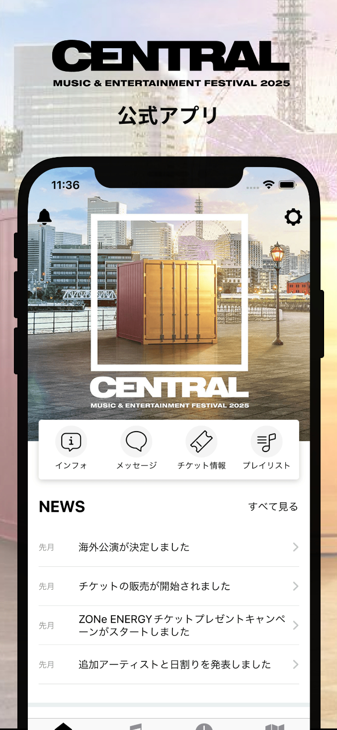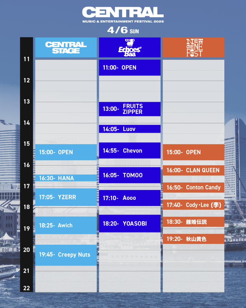 『CENTRAL』は、Kアリーナ横浜、横浜赤レンガ倉庫 赤レンガパーク特設会場、KT Zepp Yokohama、臨港パークの4会場を舞台に、“街全体を巨大なフェス空間にする”新都市型フェス。これまでに、各会場の出演アーティストやタイムテーブル、無料エリアなどでの様々な企画が発表されている。