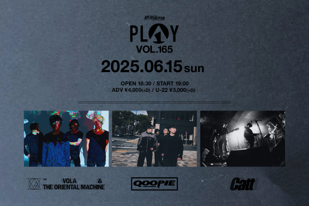 『PLAY』は、渋谷La.mamaが企画するライブシリーズ。今回の『PLAY VOL.165』では、VOLA & THE ORIENTAL MACHINE、QOOPIE、Cattの3組によるスリーマンライブが行われる。