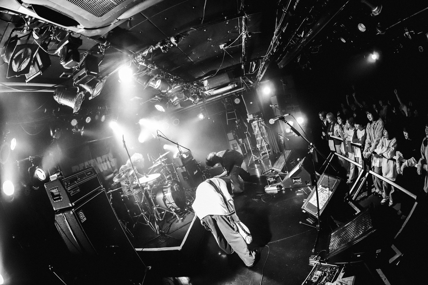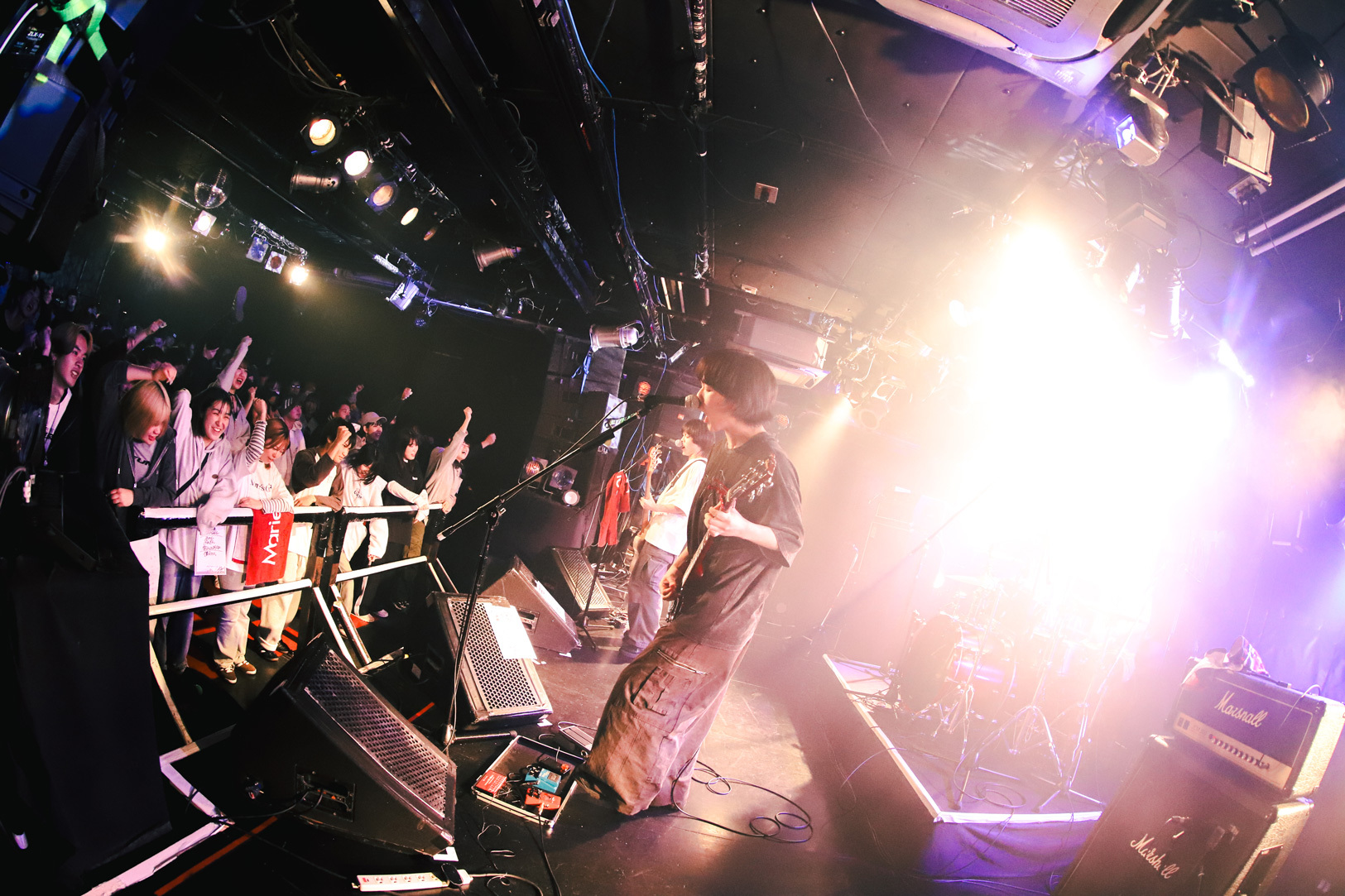 だからこそ。「力を貸してくれよ」とプレイされた「拝啓」はひと際美しかった。スポットライトを一身に浴びながらアカペラで歌いあげるハヤシの背中と、純黒のフロアから確かに聞こえてくる大熱唱。ポツンと舞台を踏みしめるハヤシはさながら銀河を彷徨うようだが、決して孤独なわけではなく、耳を澄ます必要もないほどにいくつもの応答が溢れている。この日初めてパッケージングされて手元にプレゼントされた1曲がここまでのアンセムになっていたことは、彼らが各地のライブハウスで体温に満ちたやり取りを欠かさなかった証明にほかならない。簡単には消化できない悲哀を受容し、「これでも悪くない」と思わせること。3人の言葉を借りると「想いに傘をさすこと」は、既に成されつつある。