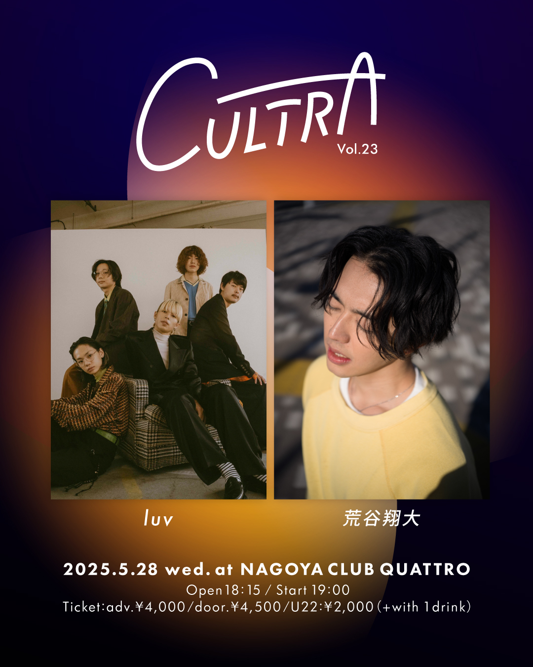 ライブイベント『cultra vol.23』が5月28日(水)に、名古屋クラブクアトロにて開催され、荒谷翔大とluvが出演することが決まった。