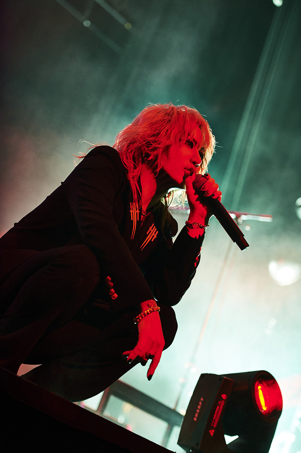 また「ここはライブハウスだ! やっちまえ!」と号令をかけての「UGLY」では、ギターリフに煽られて一気に拳が振り上がり、呼応するように戒のアクションも大きくなるという理想的なエモーションの相乗効果も。さらに「ATTITUDE」の同期イントロが鳴って、場内が《until die!》の声でいっぱいになれば、LEDに表示される歌詞に合わせて掛け声があがり、クラップにジャンプ、ヘッド&ボディバンギングと、全オーディエンスが狂乱の宴を笑顔のまま繰り広げていく。そんな客席に「頭イカレてるぞ、東京! 終わりたくねーな! だけど、ラスト行くよ!」とRUKIが号令をかけて、戒の4つ打ちが入ると、場内には大きなクラップと“ハイ! ハイ!”の声が。そして「命がけで来い! さぁ、お前らも共に歌うぞ!」と投下されたのは、彼らのライブエンディングにはおなじみの「TOMORROW NEVER DIES」だ。大サビ前で演奏が止まって、嵐のようなメンバーコールを受けたRUKIは「聞こえるかい!?」と宙に向かって4度叫び、ギターを鳴らす麗と向き合って再び歌い始めると、その輪に葵と戒のタイトなビートも加わって、the GazettEにしかないグルーヴを“5人で”生みだしていく。そして吐き出されたRUKIの血の滲むような咆哮には、the GazettEが23年間生きてきた証が間違いなく存在していた。