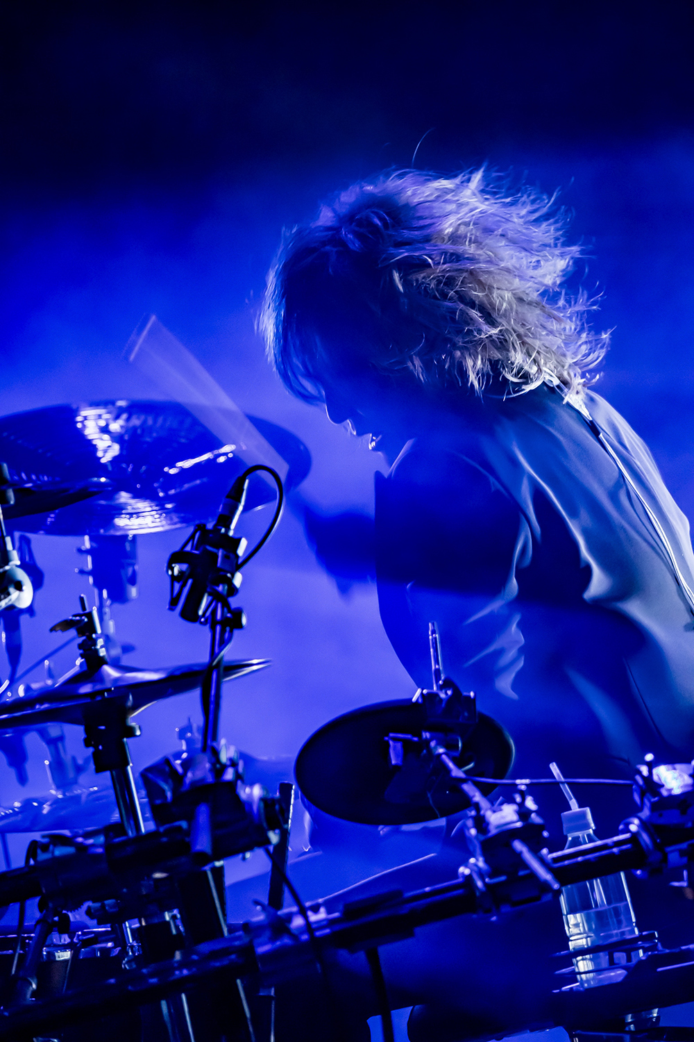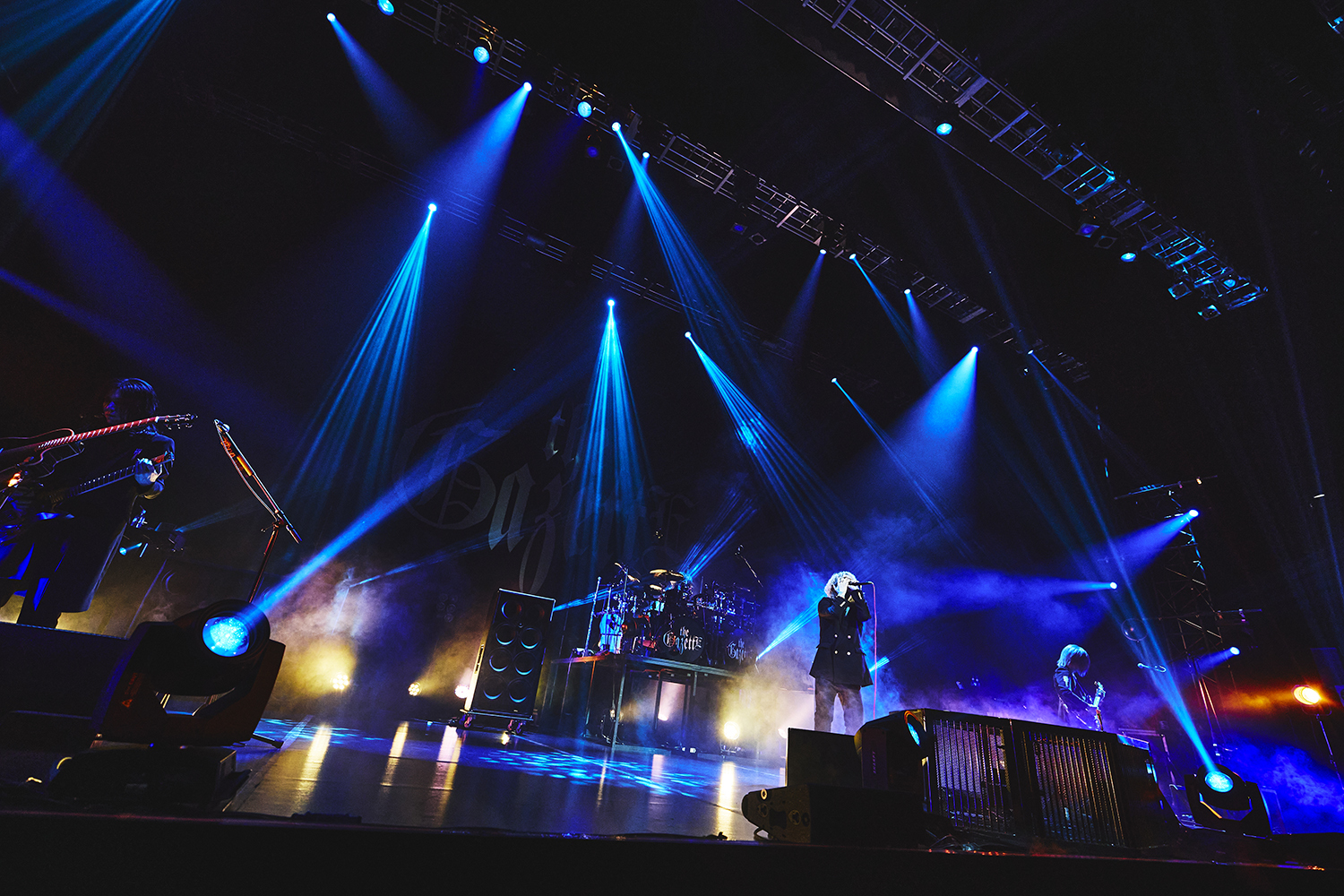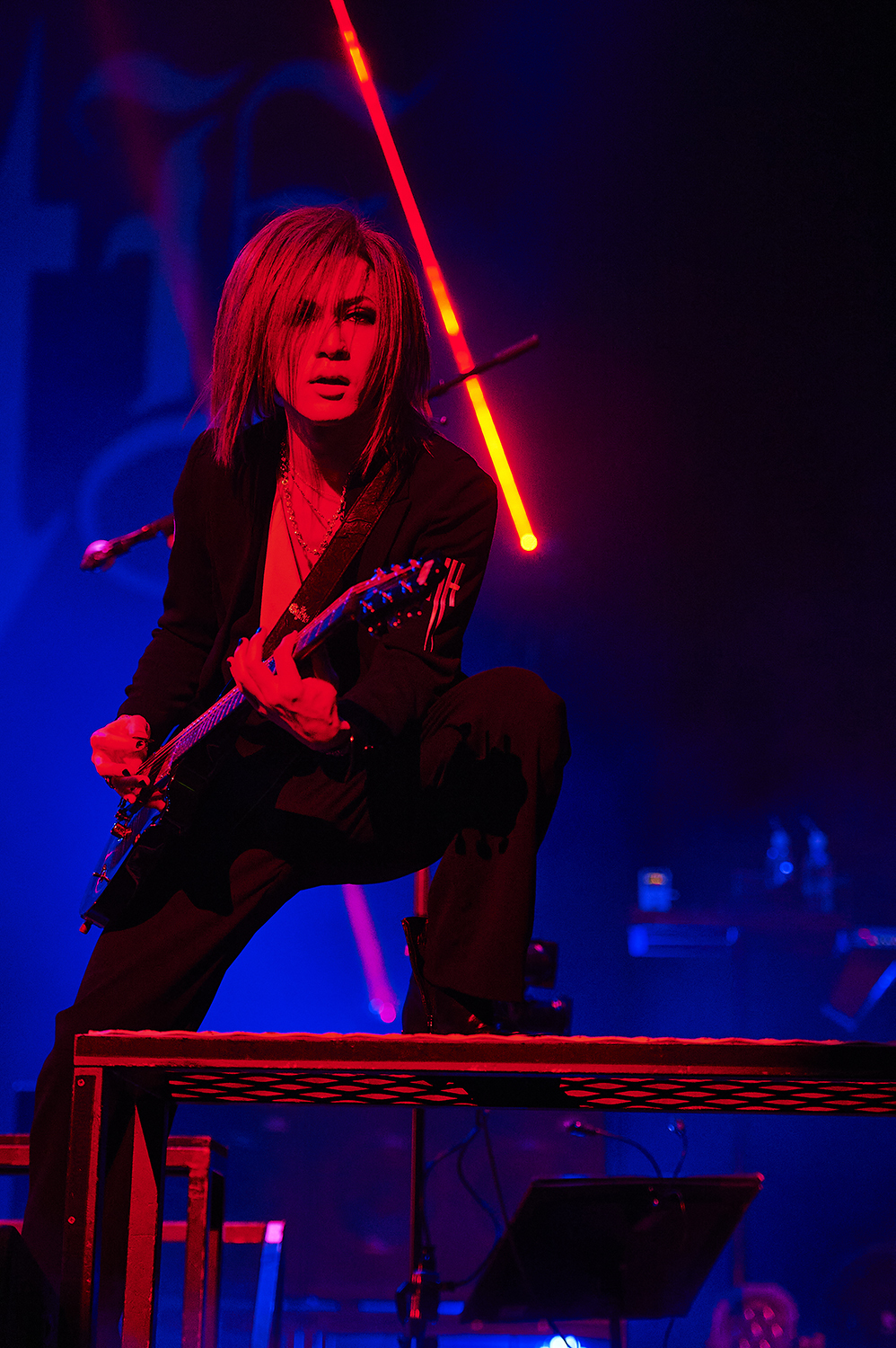 以降も結成初期の楽曲を並べて、アニバーサリーならではの序盤戦を展開。葵がイントロのリフを鳴らすなり客席の拳が振り上がった「舐~zetsu~」では、場内を飛び交うレーザー光線が目を焼き、「Sugar Pain」では赤と青のライトが瞬いて、やがて紫へと融け合っていったりと、初期曲でこれだけ大掛かりな演出を味わうことができるのも周年ライブだからこそ。同時に、激しさと艶めかしさを併せ持った「Sugar Pain」のパフォーマンスは、“甘い痛み”を意味するタイトルや照明演出と共に、the GazettEの個性は相反するように見える要素を大胆に嚙み合わせることにより形作られてきたのだと再確認させる。分厚いバッキングに支えられてRUKIがメロディックに歌い上げる「飼育れた春、変われぬ春」も、当然ながら21年前のリリース時とは比べ物にならないほど重厚感のあるものに。“証拠となる痕跡”というツアータイトルが示す通り、23年前に始まったthe GazettEというバンドが、どのような音楽を生みだして、その精神を現在まで引き継いできたのかを示すような序盤ブロックに、オーディエンスは歓喜し沸騰する。