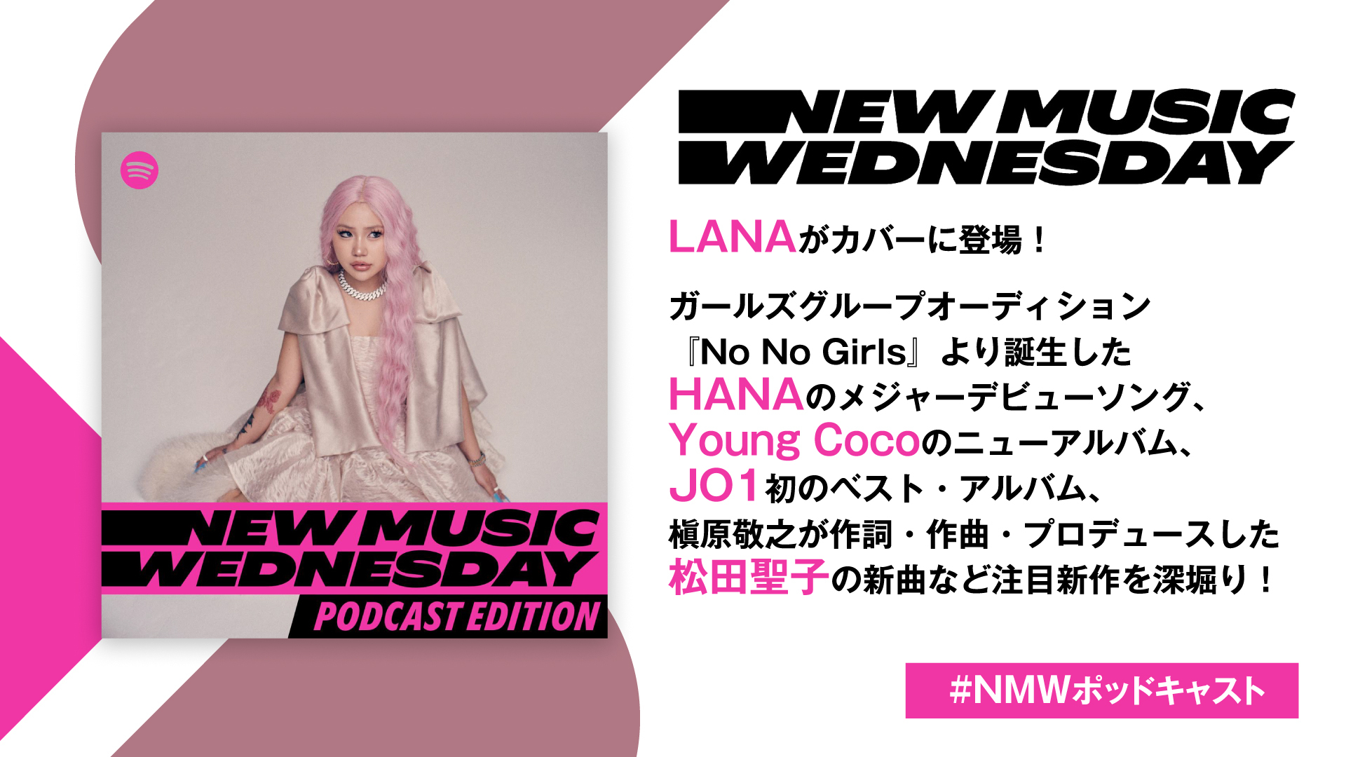 今週は、自身初の武道館ライブを終えたばかりのLANAが、1stアルバムのデラックス版をリリースしてカバーに!ガールズグループオーディション『No No Girls』より誕生した7人組ガールズグループ・HANAのメジャーデビューソングも到着!Young Cocoのニューアルバム、JO1初のベスト・アルバムも! 槇原敬之が作詞・作曲・プロデュースを手がけた松田聖子の新曲もピックアップ。そのほか、アーティストのライブやフェス情報も掲載。番組への感想やリクエストはSpotifyアプリのコメント機能から投稿を。