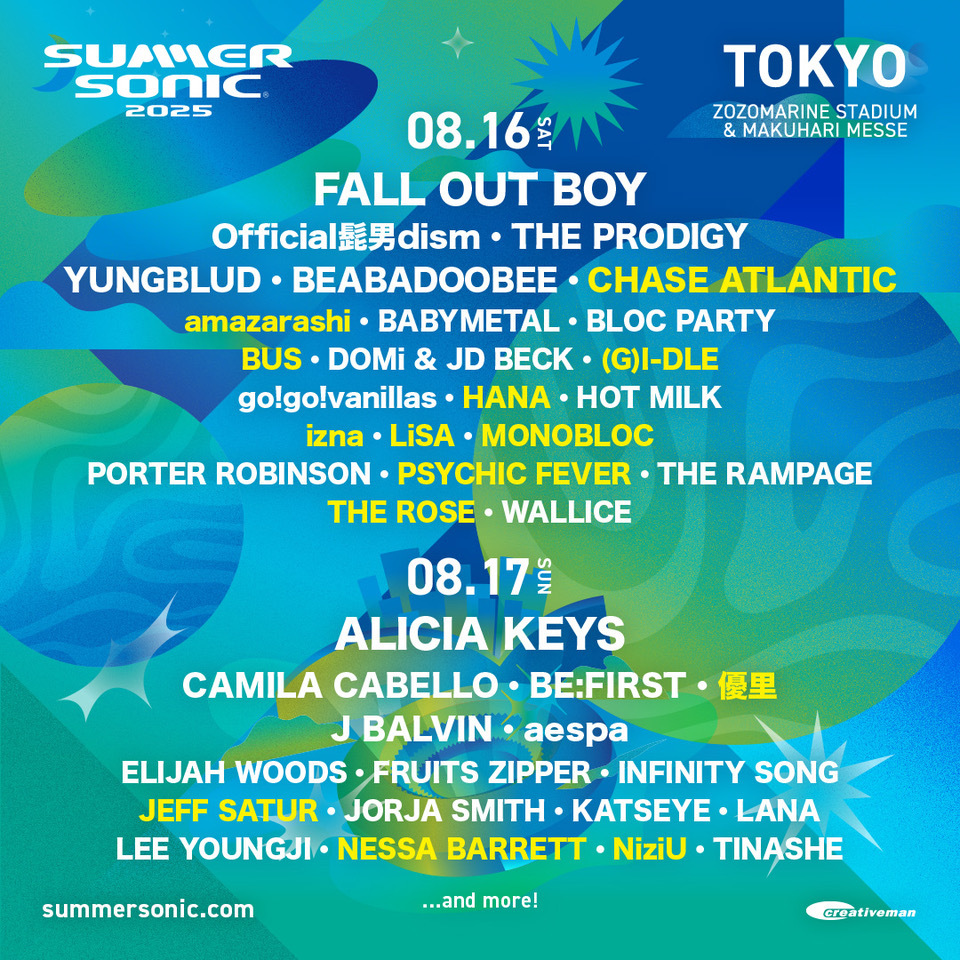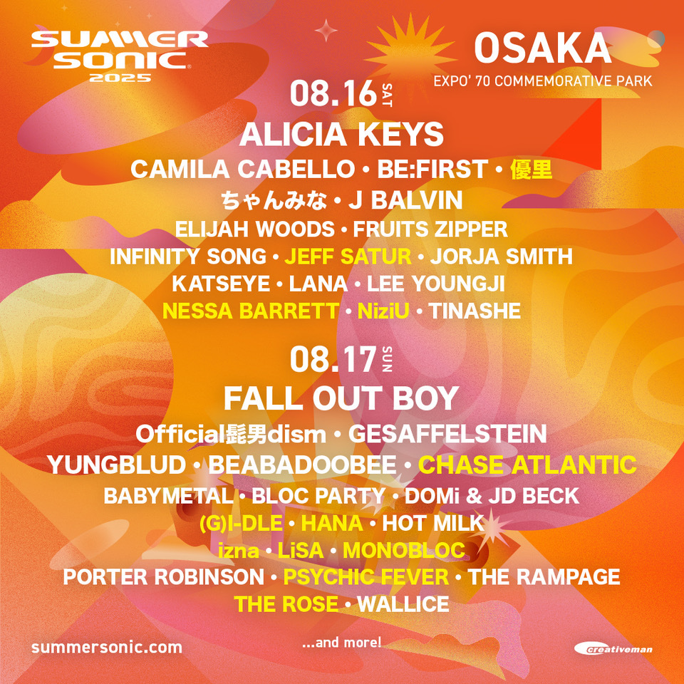 2025年8⽉16⽇(⼟)・17日(⽇)にZOZOマリンスタジアム&幕張メッセ(東京会場)と万博記念公園(⼤阪会場)にて開催される『SUMMER SONIC 2025』の第5弾出演アーティストが発表された。