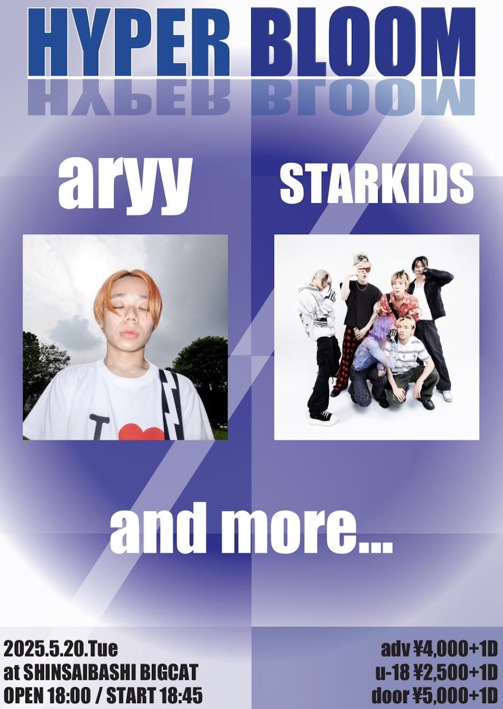 2025年5月20日(火) に大阪・心斎橋BIGCATにて、新進気鋭のアーティストがクロスオーバーする新イベント『HYPER BLOOM』の開催が決定。aryy、STARKIDSの出演が発表された。