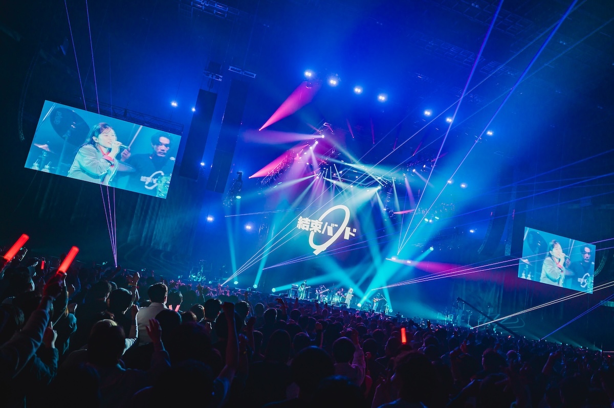 二番手は人気アニメ「ぼっち・ざ・ろっく」の作中に登場する結束バンドだ。パワフルなアンサンブルの中、結束バンドのボーカル・喜多郁代を演じる声優、長谷川育美が姿を見せた。「忘れてやらない」「ラブソングが歌えない」を続けて歌った後、「結束バンドのライブが『忘れてやらない』みたいな明るい曲で始まるのは今回が初めて。『ラブソングが歌えない』はワンマンライブで披露して以来の2度目の披露です」とレアなセットリストであることを明かした。後半、結束バンドのギタリスト・後藤ひとりを演じる声優・青山吉能が登場。後藤ひとりの初のオリジナル曲「夢を束ねて」と、「ぼっち・ざ・ろっく」とは切っても切り離せないバンドであるASIAN KUNG-FU GENERATIONの「転がる岩、君に朝が降る」を愛とリスペクトを込めて歌った。