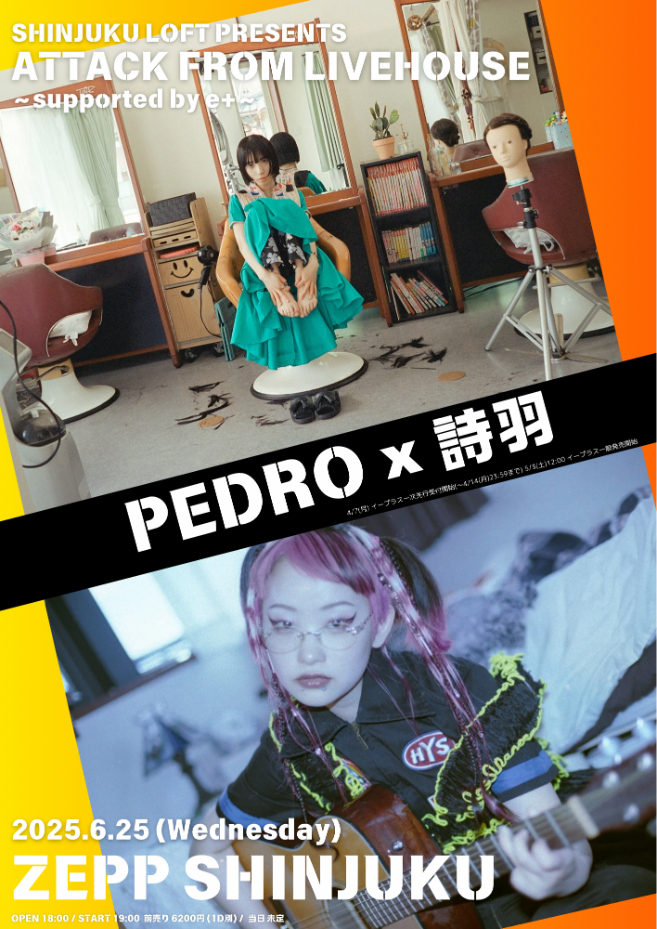 ATTACK FROM LIVEHOUSEのファイナルはzepp shinjuku公演『PEDRO × 詩羽』の2マンが決定しています。