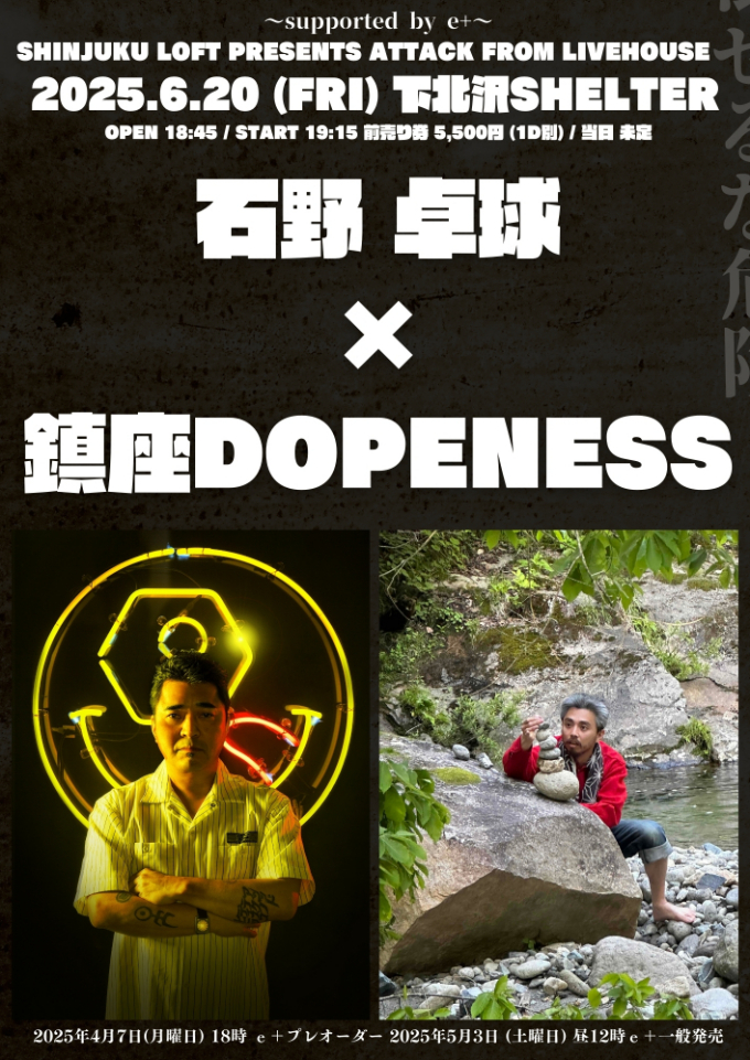 6月20日(金)の下北沢SHELTER公演には、石野卓球と鎮座DOPENESSが登場。