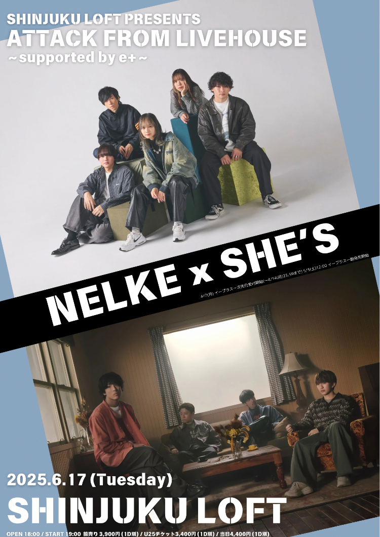 6月17日(火)の新宿LOFT公演には、NELKEとSHE’Sが出演。