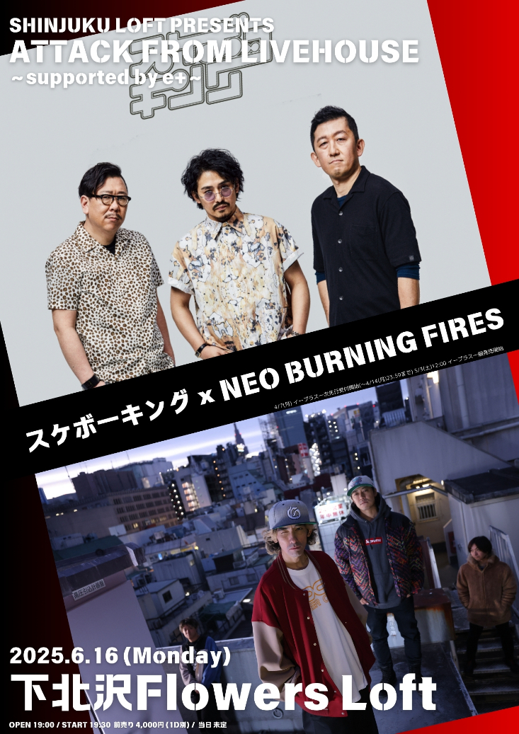 6月16日(月)の下北沢Flowers Loft公演には、スケボーキングとNEO BURNING FIRESが出演。
