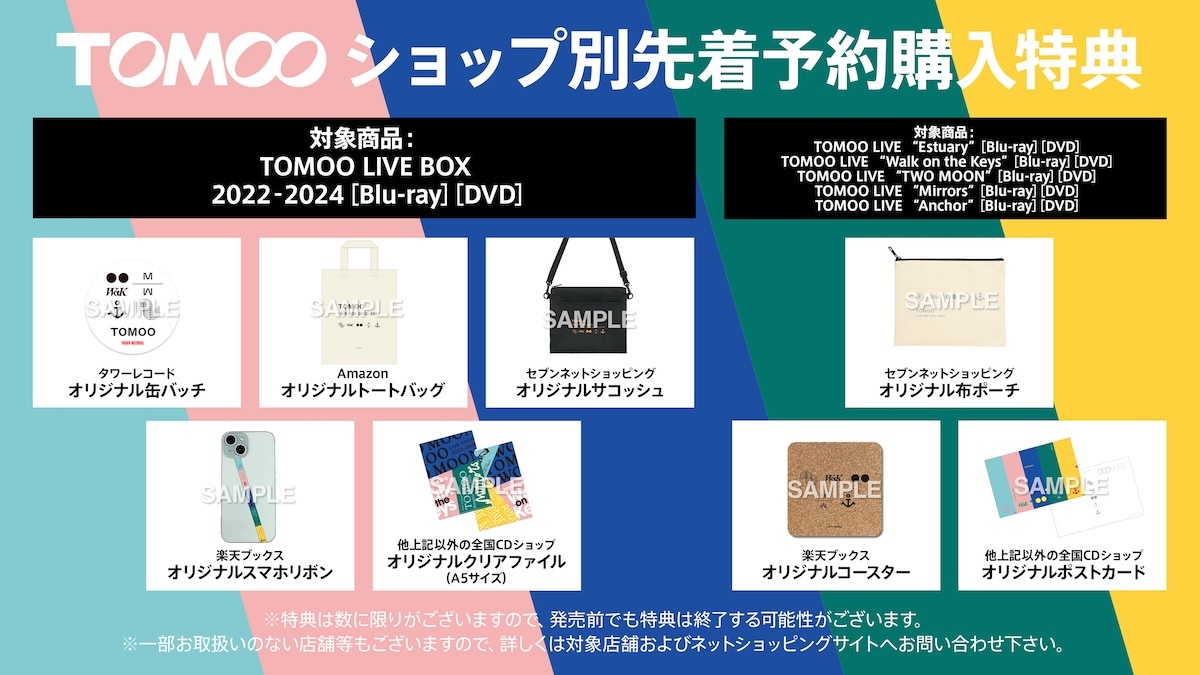 数量限定特殊仕様のBOXパッケージの他、各タイトル単作パッケージの全てBlu-rayとDVD2形態ずつの発売となっており、BOXには各公演の未公開含むライブ写真と、TOMOO本人の感想や振り返っての想いを書き留めた全100ページに及ぶブックレットを封入。アートディレクターは、これまでも多くのTOMOOのアートワークやグッズのデザインを手掛けてきた佐藤 奈穂子(yot)が担当している。