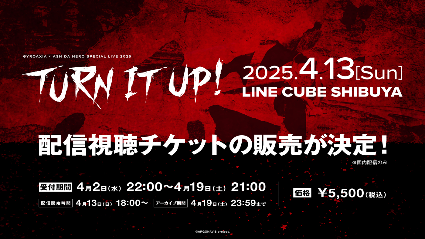 現在、『GYROAXIA × ASH DA HERO SPECIAL LIVE 2025 – Turn it up! -』はアーカイブ配信中。アーカイブ配信は4月19日(土)23:59まで。チケットが発売中。