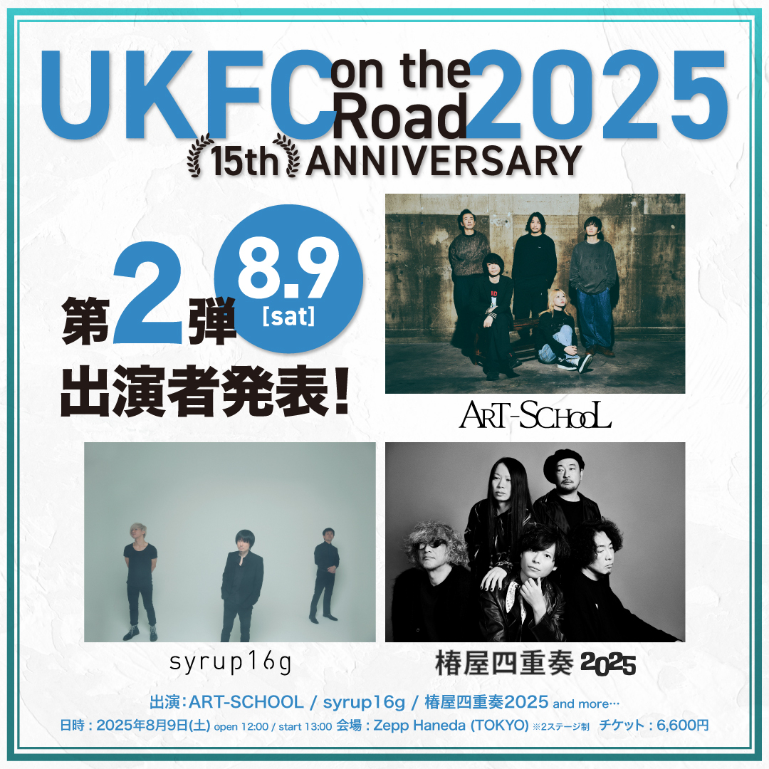 先日、第一弾出演アーティストとして、BIGMAMA、POLYSICS、The Novembers、the telephones、TOTALFATの5組が、8月10日(日)の出演者として発表された。今回第二弾として、ART-SCHOOL、syrup16g、椿屋四重奏2025が、8月9日(土)に出演することがアナウンスされた。syrup16g、椿屋四重奏2025は、今回UKFCに初出演となっている。
