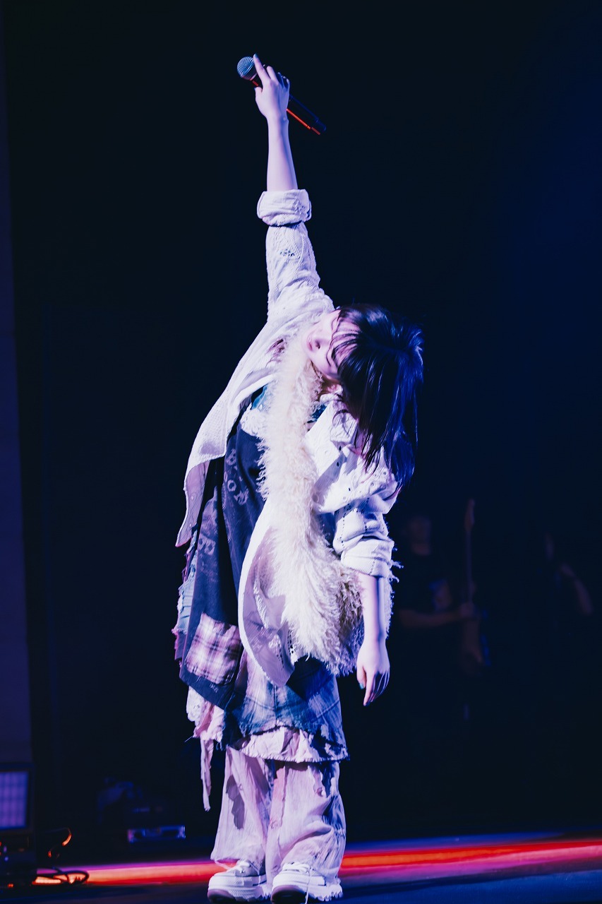 音楽を一緒に作るというテーマに具体的にアプローチしたアコースティックコーナーの意味を味わいながら、すぐにスイッチして再び大きなバンドサウンドの「真っ白」、ギターロックのダイナミズムを感じる「スローモーション」と、音像がどんどん立体的になる。因みににしなのリズムギタリストの側面のファンもいると思うのだが、この2曲ではストラトとレスポールを使い、曲に合うサウンドの吟味にも注目してしまう。「スローモーション」のエンディングを大人っぽく決めると、続く「シュガースポット」のイントロでメンバー紹介を兼ねたソロが展開する。最後に「そしてにしな!」と自己紹介し、ステージ上手に駆け出し、フロアにタオルを投げ込む彼女。オーディエンスのバイブスがさらに上がり、サビのシンガロングも大きくなっていく。にしなならではのポップワールドは続く「U+」で大きなクラップを生み出し、サビのハイトーンで誰もが気持ちを重ね合わせていくように見えた。