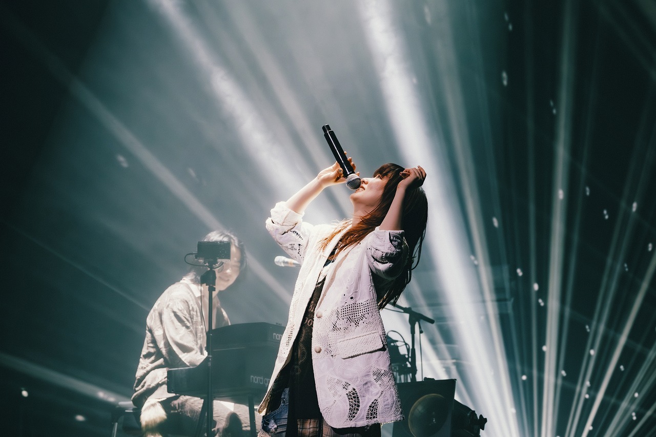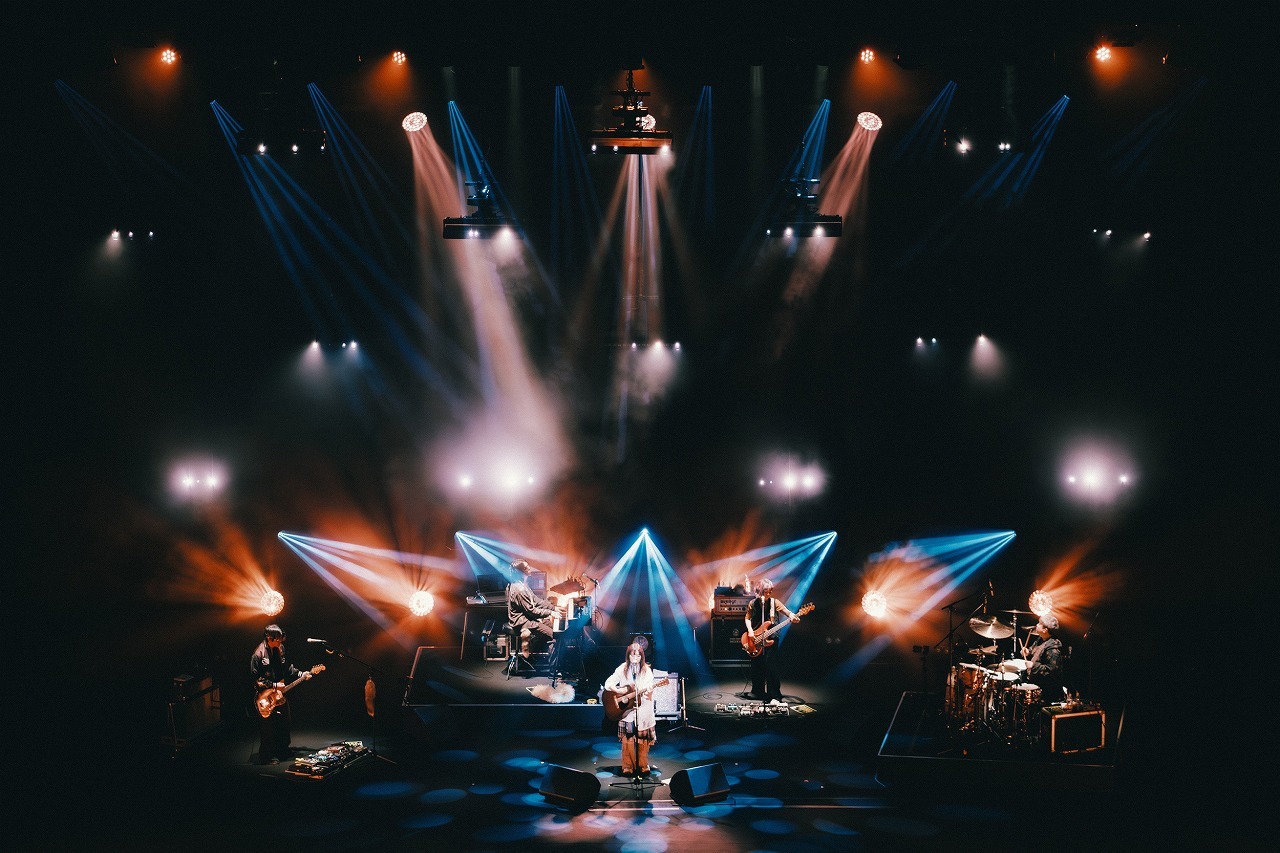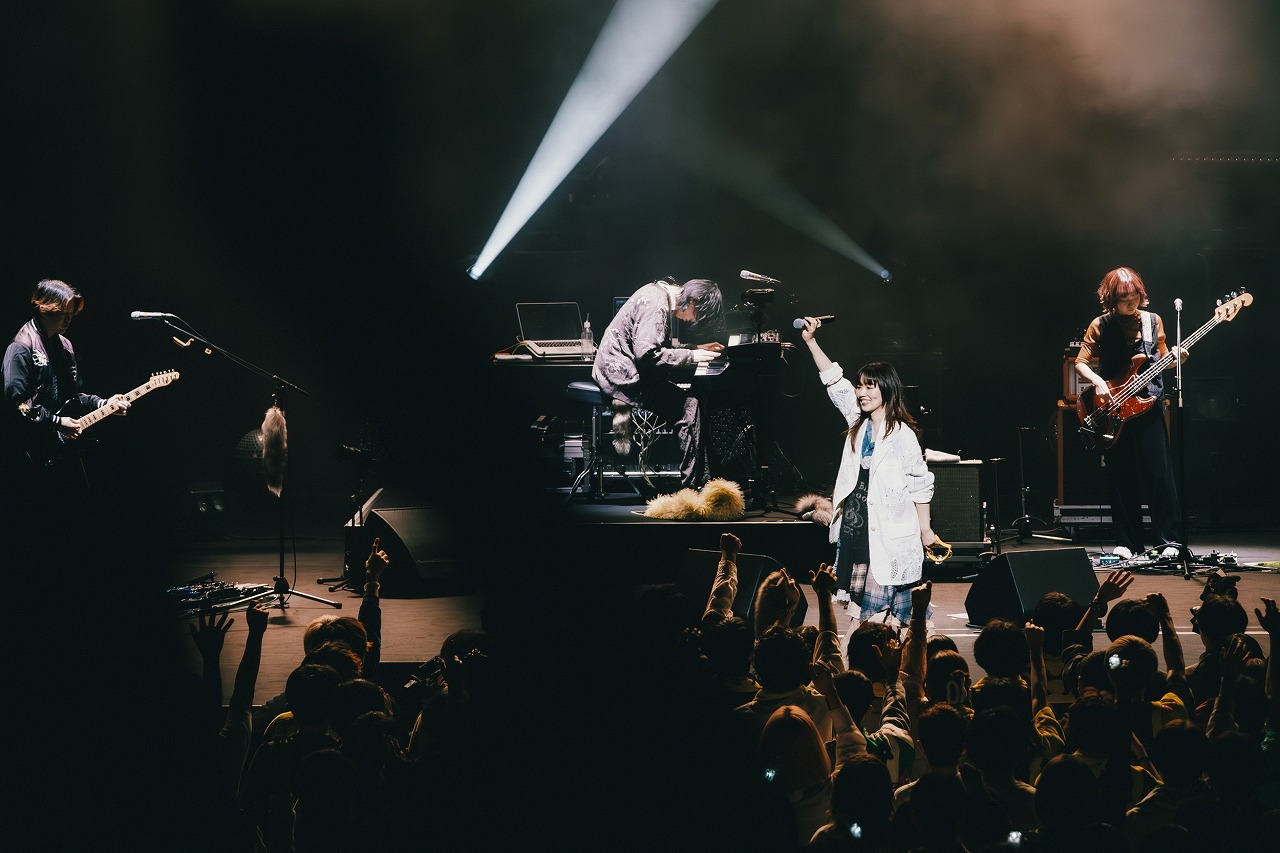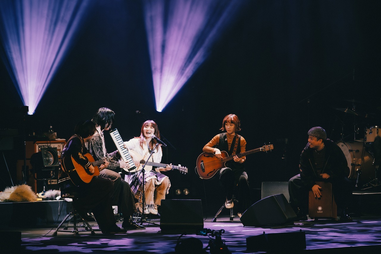 客席が感銘しているところに「煙い、煙い」と現実に引き戻し、思わず笑いを起こすにしな。ここからはライブタイトルの意味にも通じる新しい試行として、長らくやってみたかったというアコースティックアレンジでのライブが展開。まず1曲目はこれをそのアレンジで聴かせるんだ?という意外性に満ちた「FRIDAY KIDS CHINA TOWN」。ボリュームを抑えた楽器の音が、歌メロの弾むフロウはより際立ち、にしなの丸くブレス成分多めの声をビビッドに聴くことができた。そして松本のピアノのみで披露した「ランデブー」。間奏ではにしながカズーでメロディを吹き、ちょっとコミカルな味付けも。3曲目はメンバーがステージ中央にぎゅっと集まり、アコギ、鍵盤ハーモニカ、カホン、ベースという編成で「It’s a piece of cake」をクリックに頼らない呼吸を合わせる演奏で届けた。さらにこの曲ではオーディエンスの力も借りて、ラララのシンガロングが大きくなっていく。こんなに大きな会場なのに、まるでキャンプファイアーを囲む気分だった。