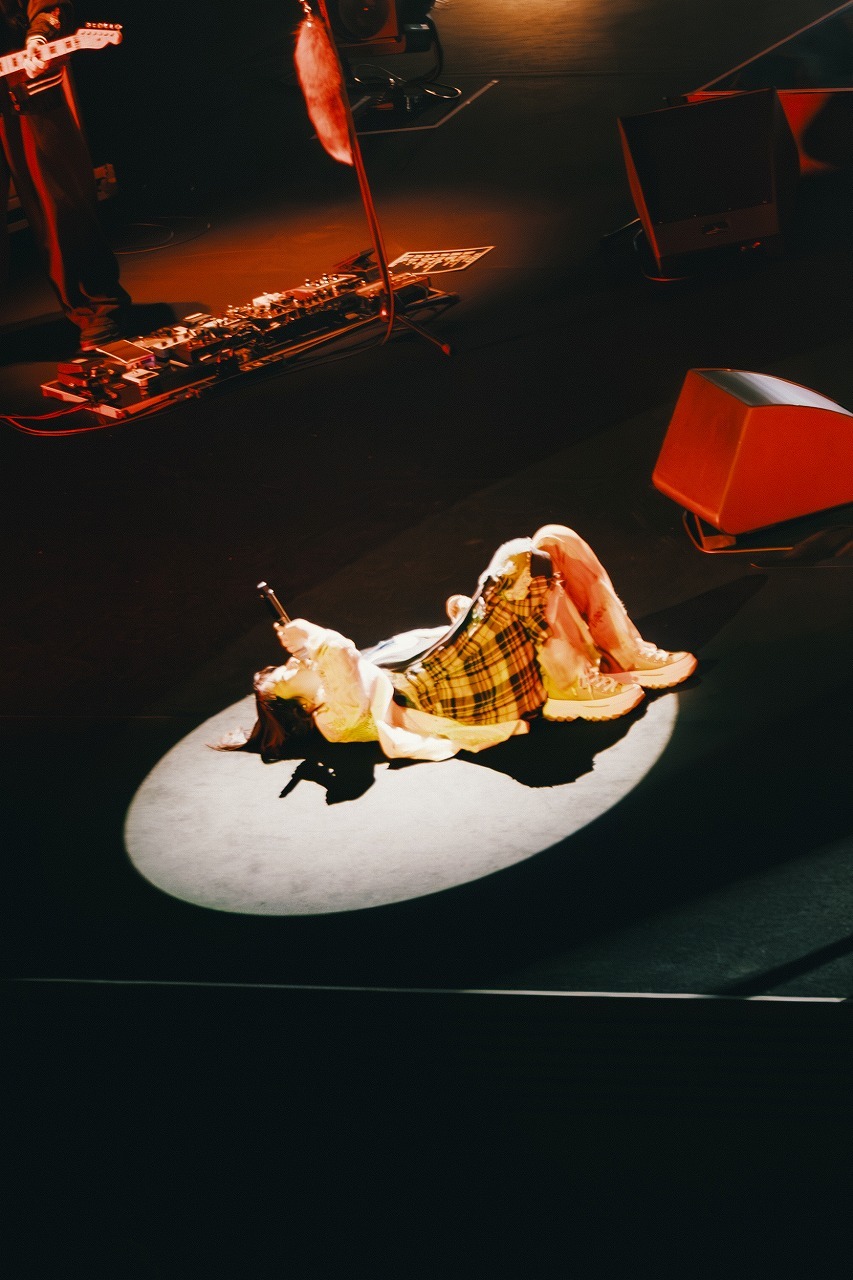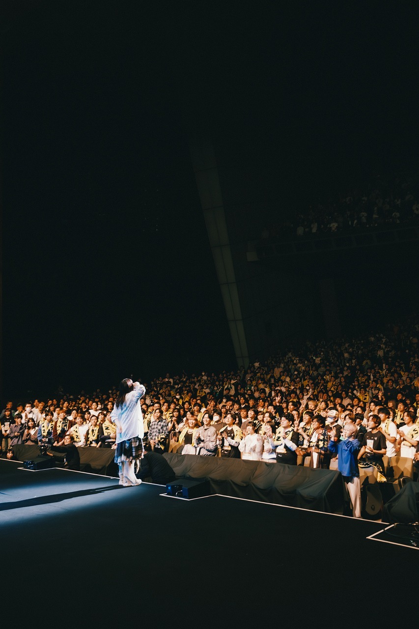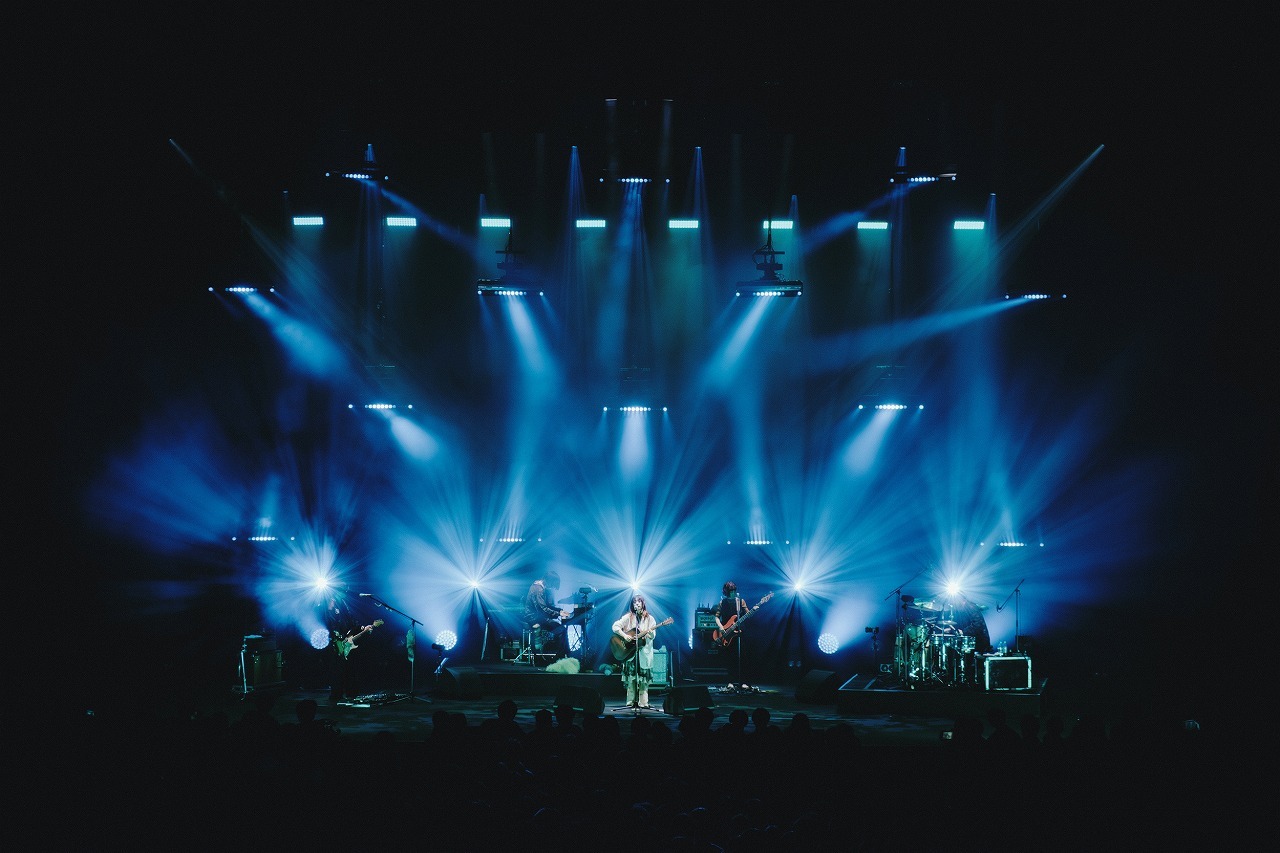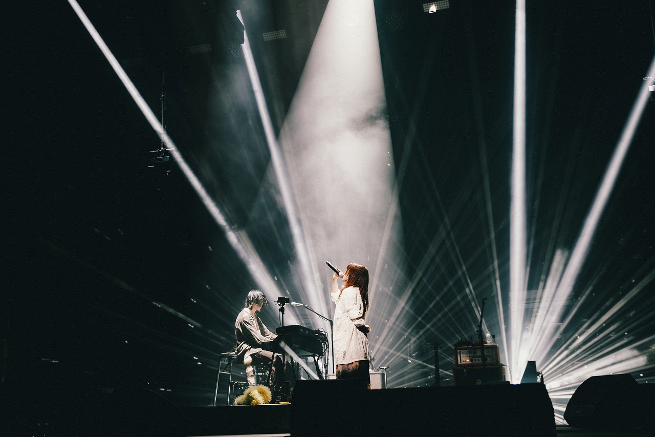客席が感銘しているところに「煙い、煙い」と現実に引き戻し、思わず笑いを起こすにしな。ここからはライブタイトルの意味にも通じる新しい試行として、長らくやってみたかったというアコースティックアレンジでのライブが展開。まず1曲目はこれをそのアレンジで聴かせるんだ?という意外性に満ちた「FRIDAY KIDS CHINA TOWN」。ボリュームを抑えた楽器の音が、歌メロの弾むフロウはより際立ち、にしなの丸くブレス成分多めの声をビビッドに聴くことができた。そして松本のピアノのみで披露した「ランデブー」。間奏ではにしながカズーでメロディを吹き、ちょっとコミカルな味付けも。3曲目はメンバーがステージ中央にぎゅっと集まり、アコギ、鍵盤ハーモニカ、カホン、ベースという編成で「It’s a piece of cake」をクリックに頼らない呼吸を合わせる演奏で届けた。さらにこの曲ではオーディエンスの力も借りて、ラララのシンガロングが大きくなっていく。こんなに大きな会場なのに、まるでキャンプファイアーを囲む気分だった。