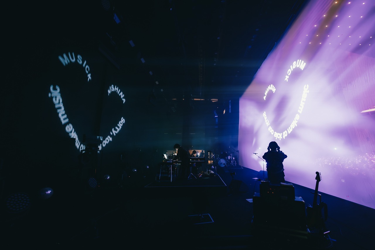 ステージ前面の紗幕には“MUSICK NISHINA、Sorry too sick to make music.”という文章が笑顔の形を作っている。直訳だと「ごめんなさい、調子が悪くて音楽が作れません」になるが、おそらくネイティブがsickを「カッコいい」とか「素晴らしい」という意味で使うことから、ヤバいぐらい音楽を作ることにハマってる、みたいな意味なんじゃないか?と捉えた。そして、その答えは新しいチャレンジを含む本編で明らかになっていく。紗幕に幼い頃、熱を出した時、母親の温かい手に安心したという文字が投影され、さらには古今東西、世界の“音楽する人”の映像がランダムに流れる。そこに第一音が流れ、バンドメンバー、そしてエレキギターを構えるにしなのシルエットが浮かび上がり、紗幕が落ちると「アイニコイ」でライブがスタートした。これまでラストにセットされることが多かったこの曲がいきなり演奏されたことで、早くも静かなグルーヴが場内に生まれ、続く「クランベリージャムをかけて」ではハンドマイクにスイッチし、肩に掛けたバッグから客席にキャンディを投げ入れながら歌う。ベースのTomiが大きくクラップの動作をして、オーディエンスの鳴らすクラップもつられてボリュームアップ。「東京マーブル」でもステージの端から端まで歩き、「ケダモノのフレンズ」ではおなじみタオル回しが自然に起こった。