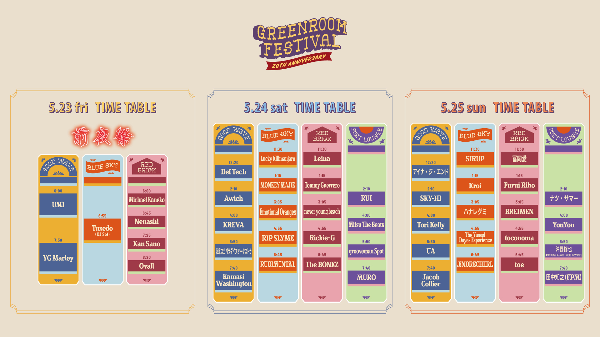 2025年5月23日(金)・24日(土)・25日(日)に横浜赤レンガ倉庫にて開催される『GREENROOM FESTIVAL 20th Anniversary』のタイムテーブルが発表された。
