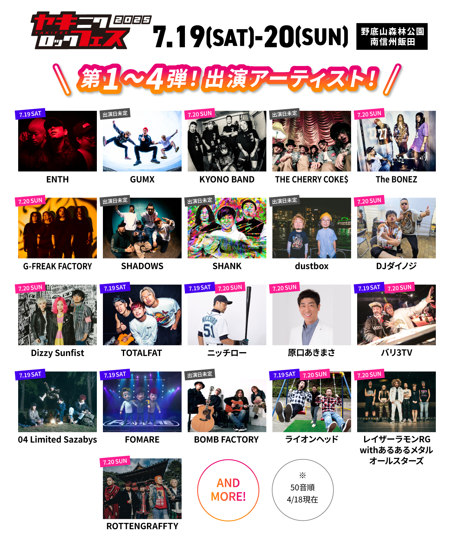 7月19日(土)、20日(日)に、長野県飯田市野底山森林公園特設ステージで開催される音楽フェス『焼來肉ロックフェス2025』の第4弾アーティストが発表された。