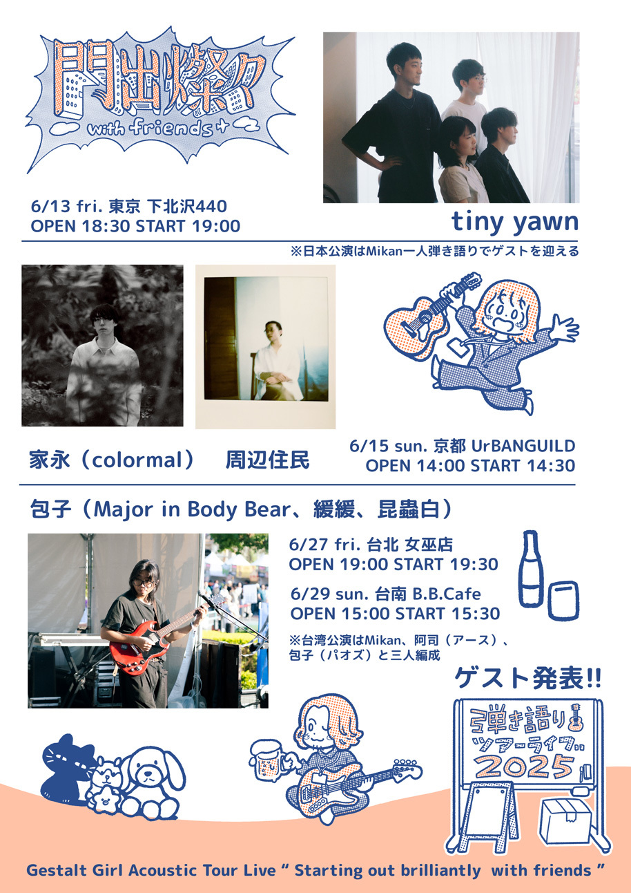 新生活で焦りや不安を抱えながら生きる人たちへ思いを込めて、2年連続で開催される本ツアー。日本および台湾の4都市で実施され、日本公演ではゲシュタルト乙女のボーカル・Mikan Hayashiが単独弾き語りで出演し、各地にゲストアーティストを迎える形で行われる。東京公演には、透明感ある歌声と繊細なサウンドが光るバンド・tiny yawn、京都公演には、繊細さと力強さを併せ持つ大阪発バンド・colormalのボーカル・家永と、シンガーソングライター小倉聖によるソロプロジェクト・周辺住民の出演が決定した。
