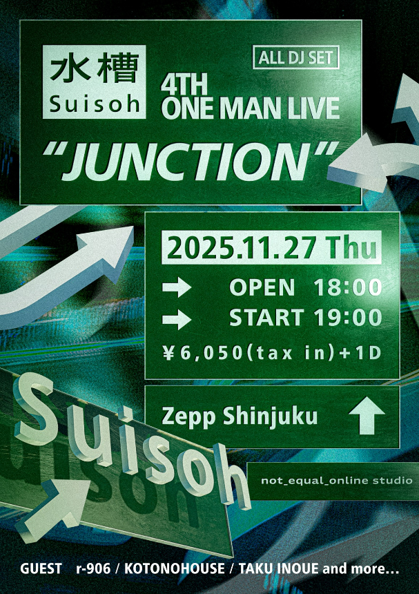『4TH ONE MAN LIVE“JUNCTION”』は、「水槽の音楽活動の交差点」をテーマにしたワンマンライブ。当日は、水槽が全編で歌唱とDJを織り交ぜながら、各方面からのゲストを呼び込むとのこと。第一弾ゲストとしてr-906、KOTONOHOUSE、TAKU INOUEが出演することも明らかになっている。なお、出演ゲストは随時追加発表される予定。
