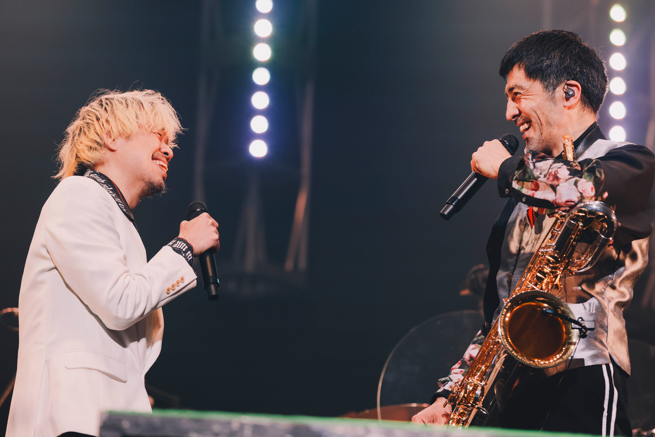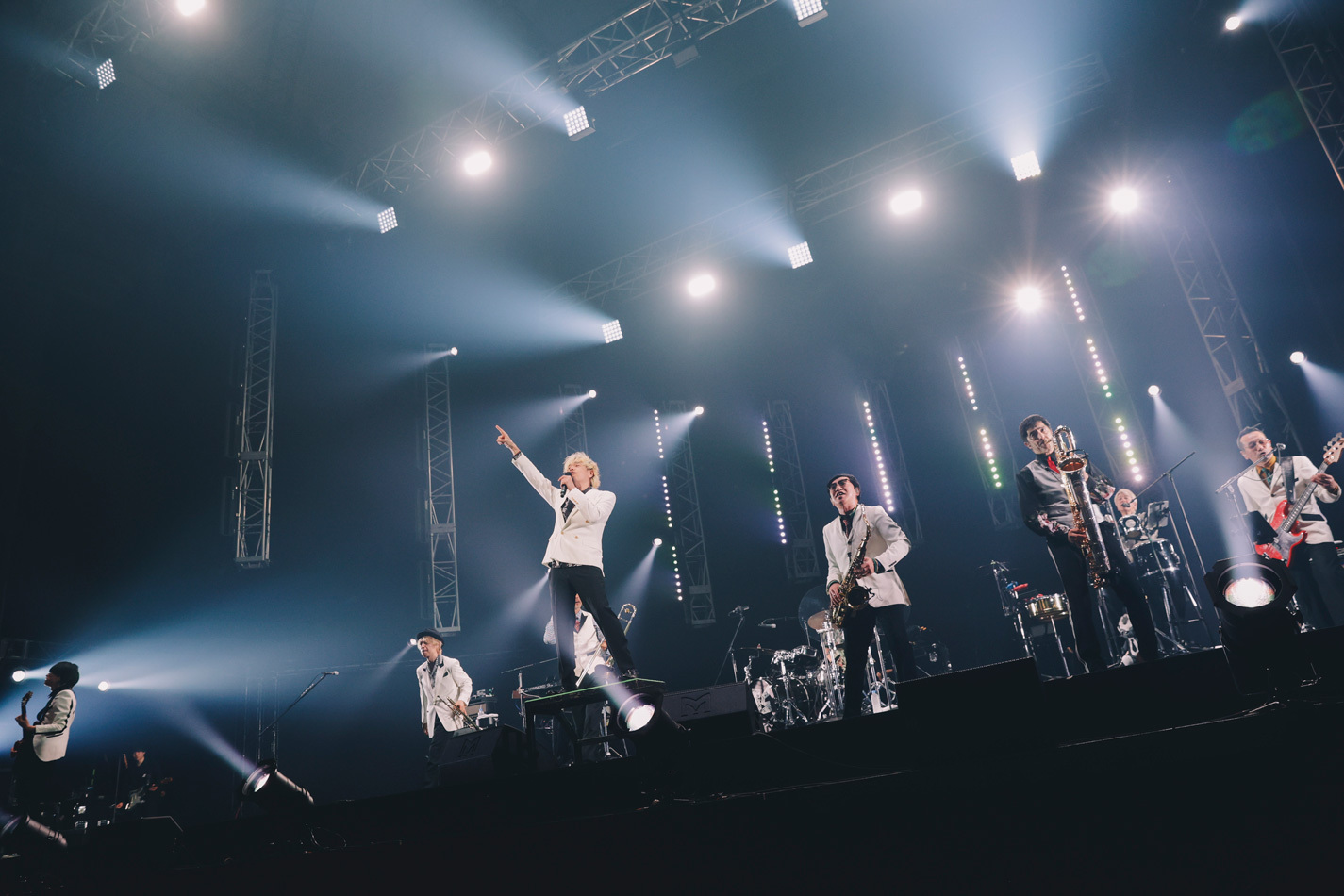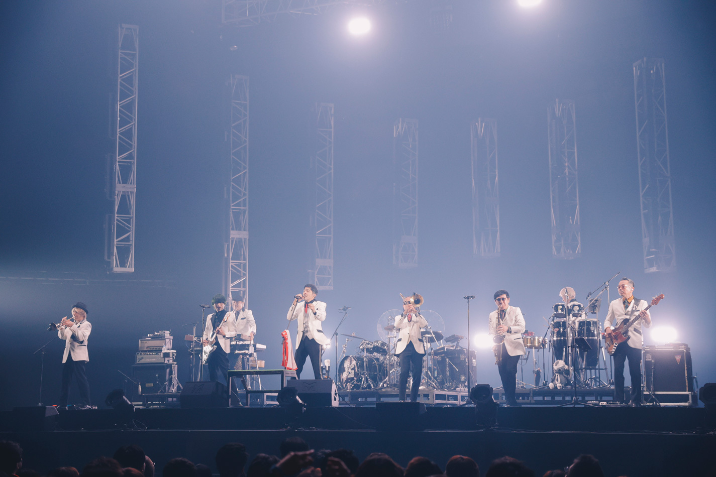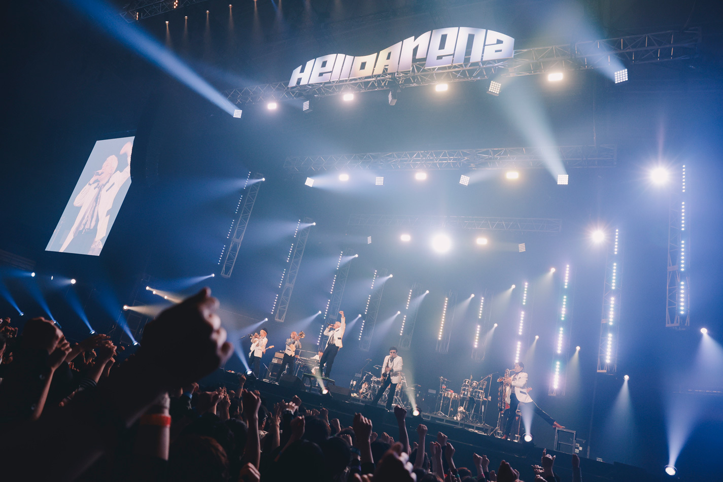 「帰りたくないね。もっと名残惜しい夜に!」、TAKUMAが名残惜しそうに言葉を漏らし「風に戦ぐブルーズ」へと繋ぎ、いまこの瞬間の気持ち良さをぎゅっと音に詰め込んでいく。ラストは「もうひと盛り上がりしようぜ!」と「Paradice Has No Border」で抜群のスカパラサウンドに魅せられ、観客はもちろん、ダイスケはん&ナヲ&TAKUMAも再登場! アンコールでは「Dale Dale!~ダレ・ダレ!~」で盛大に踊り明かしたあと、「本当に幸せです!ありがとう!帰る時も幸せでいてね。これからも幸せでいてね。また会おうね!」と、その場にいた観客みんなの気持ちを代弁するようなメッセージを残し、『Hello Arena』初日の幕が閉じた。