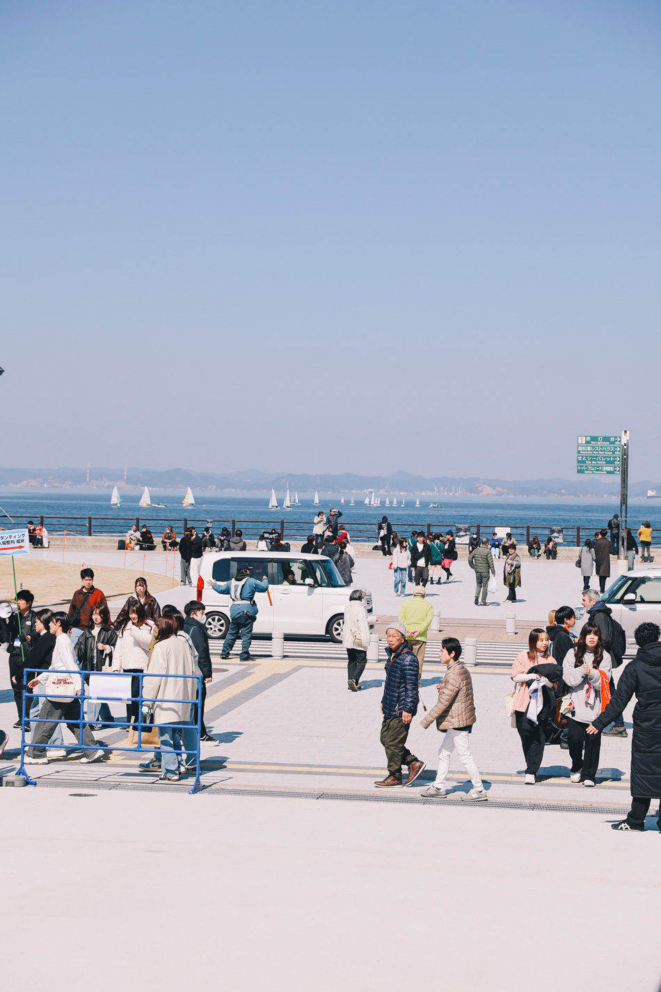 フードテントでお目当てのグルメを手にした人はサブアリーナで休憩を取るのはもちろん、会場の目の前は瀬戸内の海が広がっていることから、海を望みながらのんびりとした時間を過ごす人の姿も。また、メインアリーナ内にはカフェもオープン。メインアリーナには音を遮る壁がないことから、休憩しながらも臨場感たっぷりのライブを聴くことができるのもあなぶきアリーナの特徴だ。