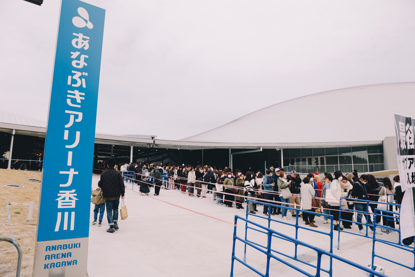 会場に向かうため、JR高松駅を降りるとすでに街の雰囲気が“お祭り”感いっぱいの賑わいを見せていた。以前に掲載された会場レポートでも記したように、アリーナはとにかく駅チカ!! 駅を出て会場へ向かう道中には「え…!? めちゃくちゃ近い!」「駅から会場が見えてる!」と、アクセスの良さに驚く人の声も聞こえるほどで、徒歩5分もかからずにあっという間に会場に到着。メインアリーナの反対側にあるサブアリーナでは、入場パスの交換やグッズ販売などが行われ、ライブ会場となるメインアリーナはすぐ目の前ということもあって、開演まで観客はみな思い思いの時間を過ごしている。