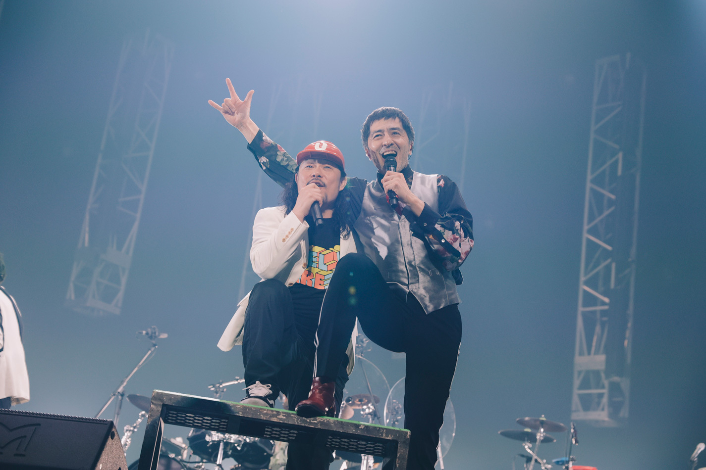 昨年でデビュー35周年を迎えた彼らにとって、初めてのステージでも”気持ちいいポイント”を見つけるのはいとも容易くて「スキャラバン」「DOWN BEAT STOMP」など、極上のスカサウンドで誰も彼もを自由気ままに踊らせてしまう。その楽しさはバンド仲間にも通じていて、ステージ中盤はゲストボーカルを迎えての贅沢なコラボで観客を大いに楽しませてくれた。まずはマキシマム ザ ホルモンからナヲ&ダイスケはんが加わり、”サヌキスカパラダイスオーケストラ”で「恋のメガラバ」を。さらに10-FEETのTAKUMAとともに「第ゼロ感」をコラボ! スカパラといえばゲストボーカルコラボとのコラボ。この日のステージでも期待はしていたけれど、まさかのコラボ相手のオリジナル曲でのパフォーマンスに観客は大喜び。