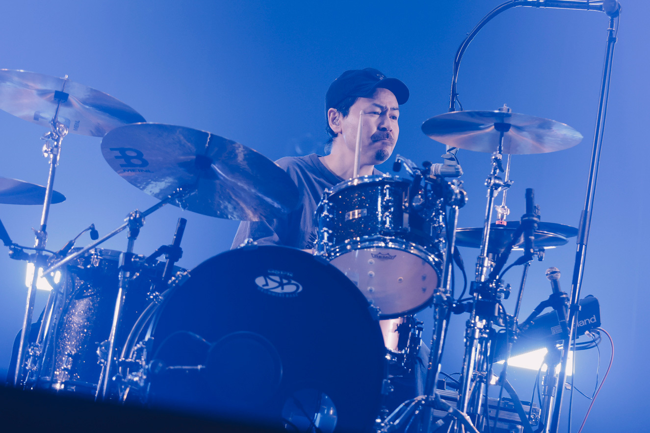 「まだまだ踊れるか、香川!」の煽りのひと言で加藤隆志(Gt)のギターが心のど真ん中を爽快に突き抜けていく。感情を開放しきった観客の表情はとにかく多幸感いっぱいで、タオルを振り回し、両手を掲げて、全身で音を浴びている。“楽しんだもん勝ち”、そんな気持ちが存分に伝わってくる。その盛り上がりはステージからもよく見えているようで「すごい盛り上がり! これからここで様々な良いことが起きるんだろうね♪ みんなポジティブなエネルギーに、幸せな力で満ち溢れてるよ。戦うように楽しんでくれ!」、谷中があなぶきアリーナがここから大いに盛り上がってほしいと想いを語り、「追い越してく星」では茂木欣一(Dr)がご機嫌に歌い、川上つよし(Ba)も軽快なリズムを弾き出していく。さらに、「天空橋」では大森はじめ(Per)の盆踊り的に躍らせる爽快なパーカッションでフロアは大盛り上がり。