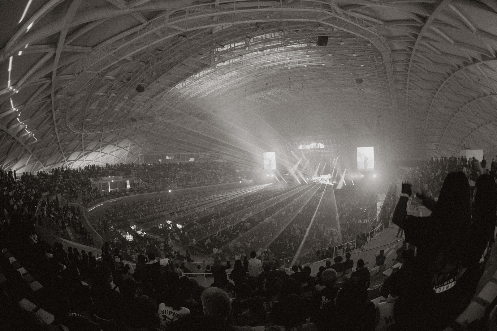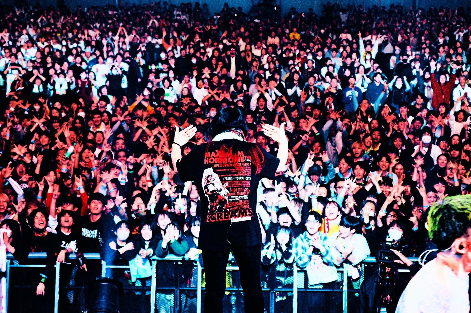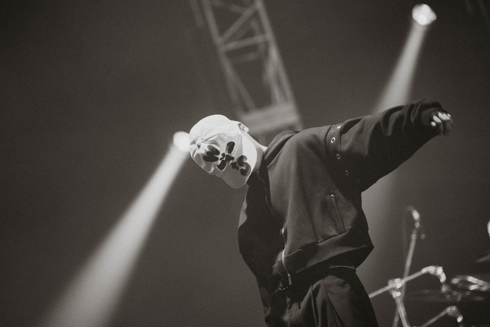 「アリーナができるって一大事だよね? 楽しみにしてくれてたんだよね。みんなの盛り上がりが初めてじゃないみたいで嬉しかった」と、イベント出演に感謝の気持ちを伝える彼。トップバッターということもあって、『Hello Arena』をもっと呼びやすく、”ハロアリ”で呼び合おうと、観客の気持ちを高めると、「BOY MEETS GIRL」「NERVEs」でアイロニーたっぷりなラップやトキシックなトラックでフロアを心酔させる。「NOISE」「マイティーマイノリティ」と、顔は見えないけれど、多彩なバンドサウンドでいろんな表情を見せていく彼。ぐっと熱を高めるギター、矢継ぎ早に繰り広げられるリリックで、フロアの熱量はさらに上昇。
