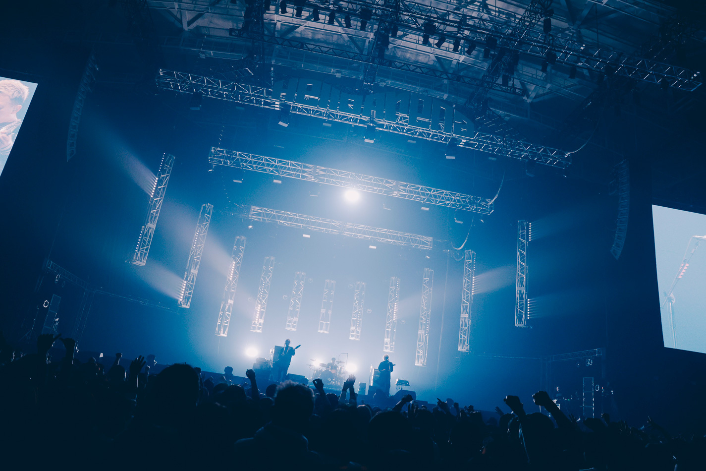バンドタオルが一面に掲げられる景色がアリーナいっぱいに広がるなか、TAKUMA(Vo.Gt)は「あんたらと心中するような気持ちで来てるから。行けるとこまでいきましょう!(今日は)全員にとって一生に一度のライブなんやから。同じ日は二度とない」、その言葉の後に鳴り響く「RIVER」のギターリフで、一斉にアリーナ中から歓声が沸き起こる。「さぁ、香川。どんな場所? どんな願いをもって今日、どこまでいけるかな? めっちゃ静かなバラードをやるんで、座って観てください。どうぞ!」と言いながら打ち出したのは「goes on」。KOUICHI(Dr.Cho)のドカドカ腹に刺さるような剛毅なビート、NAOKI(Ba.Vo)のご機嫌なベースラインがたまらなく気持ちいい。