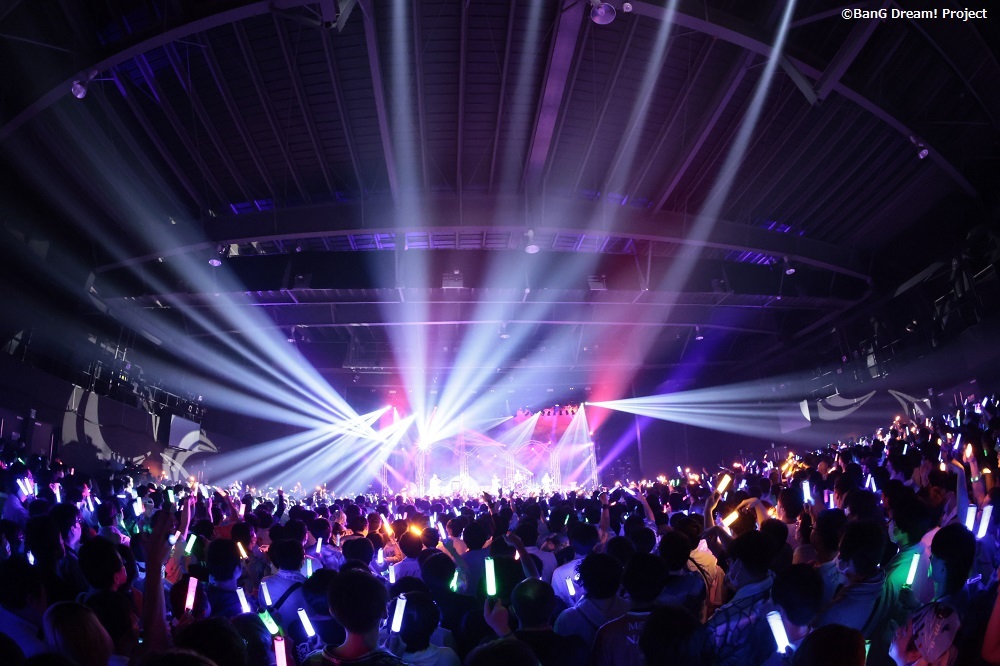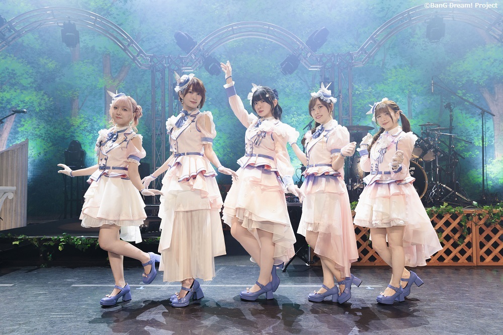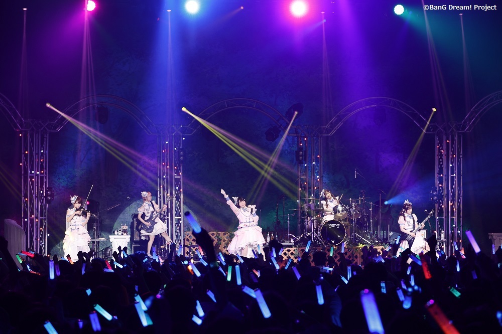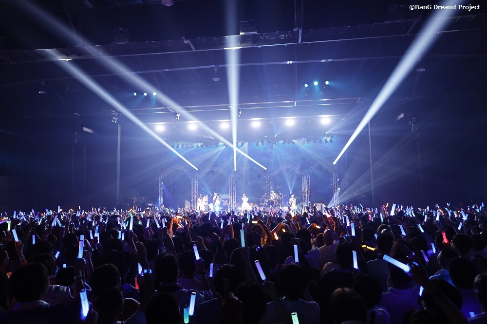 本編が始まると、まず紗幕にオープニング映像が映し出され、キャラクターと本人がリンクするメンバー紹介映像が流れる。豊洲PITに姿を現した倉田ましろ(CV:進藤あまね、Vo.)、桐ヶ谷透子(CV:直田姫奈、Gt.)、広町七深(CV:西尾夕香、Ba.)、二葉つくし(CV:mika、Dr.)、八潮瑠唯(CV:Ayasa、Vn.)の5人はステージ最前の紗幕が上がるや、超満員のオーディエンスにクラップを要求。オーディエンスの高らかな手拍子の中、ステージ初披露の「Wreath of Brave」でライブをスタートさせる。この曲で七深とつくしが繰り出すグルーヴィなビートと透子の単音カッティング、瑠唯の柔らかなリードやオブリガードが絡み合う中、ましろが伸びやかな歌声を響かせると、会場は大きな盛り上がりを見せながらも、どこかジェントルなムードに。前回公演でそれぞれが抱える苦悩を乗り越えたメンバー5人。本公演では、冒頭から笑顔いっぱいに観客を迎えていた姿が印象的だった。