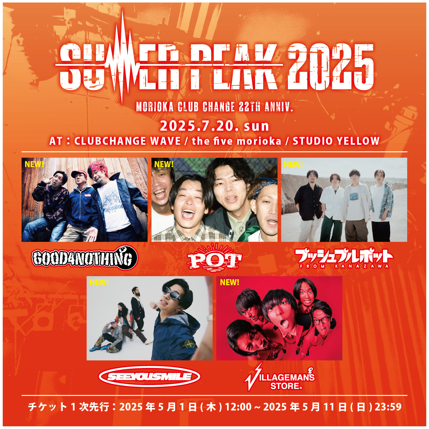2025年7月20日(日)に、岩手・盛岡ClubChangeが新たに開催するサーキットイベント『SUMMER PEAK 2025』の第1弾アーティストが解禁。GOOD4NOTHING、POT、プッシュプルポット、See You Smile、ビレッジマンズストアの出演が発表された。