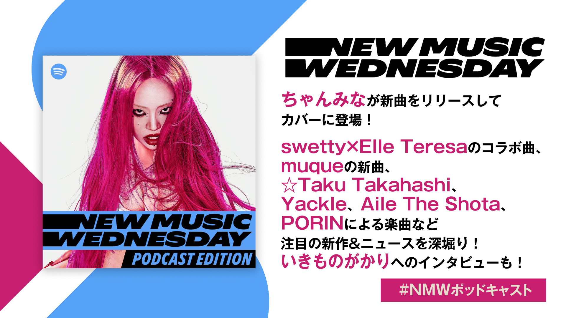 今週はちゃんみなが新曲をリリースしてカバーに登場。ヒップホップフェス『POP YOURS』から生まれたswetty×Elle Teresaのコラボ曲、muqueのテレビアニメ『ONE PIECE』新エンディング主題歌、☆Taku Takahashi、Yackle、Aile The Shota、PORINによる楽曲など、この1週間の気になる音楽ニュースも深堀り!さらに。ニューアルバム『あそび』をリリースしたいきものがかりへのインタビューもお届け。そのほか。アーティストのライブやフェス情報も掲載。番組への感想やリクエストはSpotifyアプリのコメント機能から投稿を。