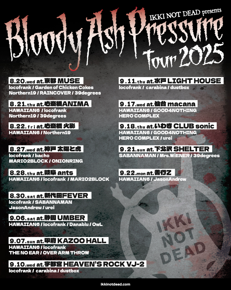 『Bloody Ash Pressure TOUR 2025』は、HAWAIIAN6やlocofrankを擁するレーベル・IKKI NOT DEADが、創設18年目にして初めて主催する冠ライブツアー。locofrank、HAWAIIAN6ら同レーベル所属バンドが各地でゲストを迎え、全国を巡る。