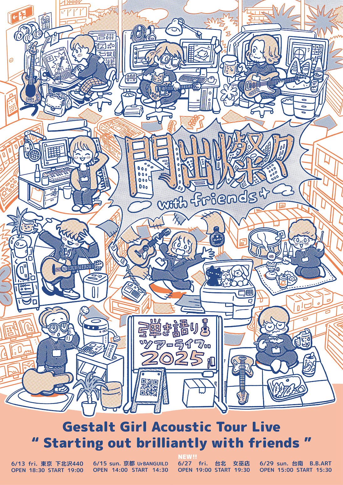 日本語で歌う台湾のバンド・ゲシュタルト乙女。2024年にはEP「仕事」をリリースし、日本と台湾でフルバンド編成のツアーを開催した。近年は『MINAMI WHEEL』『ONE PARK RIVERFES』『CIRCLE』など、日本の音楽フェス出演も増え、日本のアーティストとの対バンライブも多い。さらに今年3月末には、台湾・高雄で開催された台湾最大級の音楽フェスティバル『大港開唱Megaport Festival』に、2年連続で出演した。台湾と日本を中心に、着実にファン層を広げ続けているゲシュタルト乙女。今回は6月に東京・京都・台南の3都市で開催される弾き語りツアー『門出燦々 with friends』について話を聞いた。インタビューの舞台となったのは、彼らが「ずっと憧れていた」という大阪・千日前の味園ユニバース。ゲシュタルト乙女にとって初めてとなる同会場でのライブを前に話を聞いた。