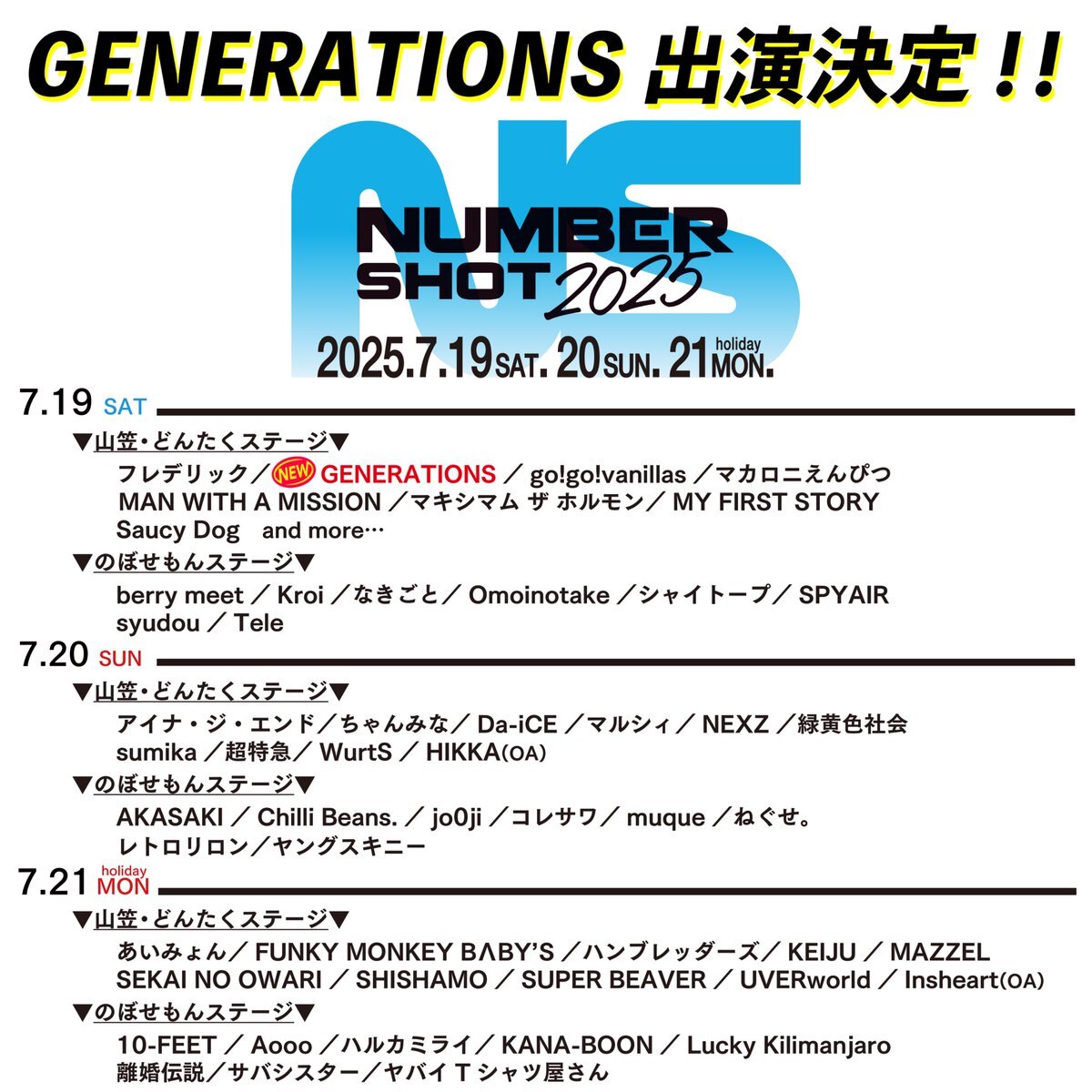 2025年7月19日(土)・20日(日)・21日(月祝)の3日間、みずほPayPayドーム福岡・シーサイドももち海浜公園地行浜ビーチにて開催される九州最大級の夏フェス『NUMBER SHOT2025』の追加発表で、GENERATIONSの出演が発表された。