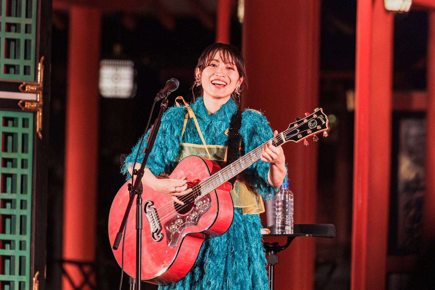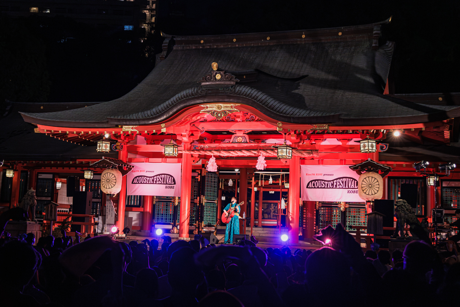 ライトアップされた生田神社で大トリを飾ったのはmiwa。お祓いの神事を行ったのち、鮮やかな朱色の拝殿に1人立ったmiwaは赤いアコギを持って、デビューシングル「don’t cry anymore」を高らかに歌う。伸びやかで凛とした歌声がとても美しく、木々と建物に囲まれた境内の空気は澄み切っていた。
