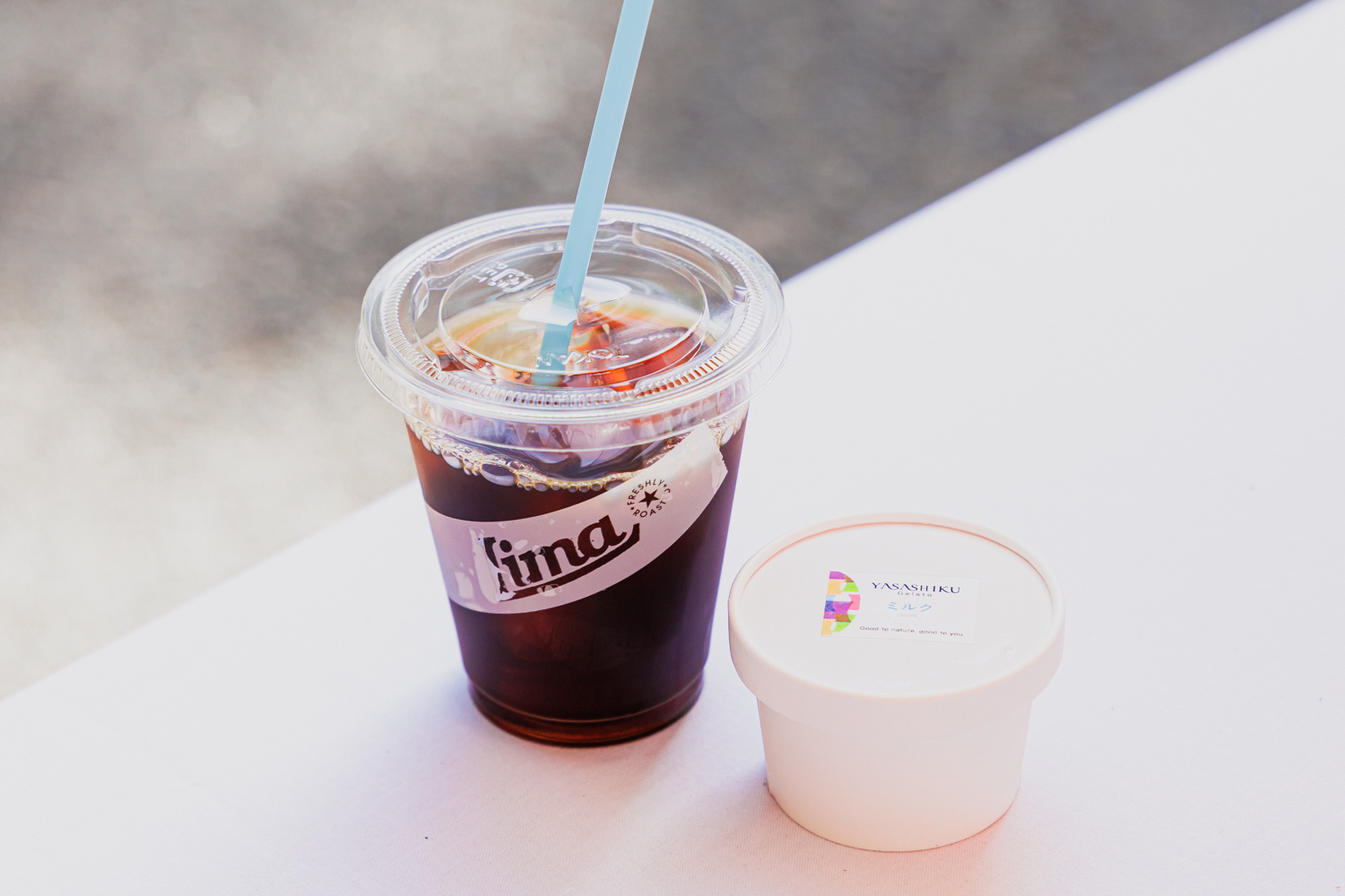 生田神社の境内には、日本丸天醤油株式会社が手がける着色料・香料不使用のサステナブルスイーツ「YASASHIKU Gelato」と神戸のコーヒースタンド「LIMA COFFEE」が出店。蒜山のジャージー牛乳と甘酒を使った「ミルク」ジェラートと、スッキリとした味わいの水出しコーヒーは最高の相性で、歩き疲れた身体を潤してくれた。