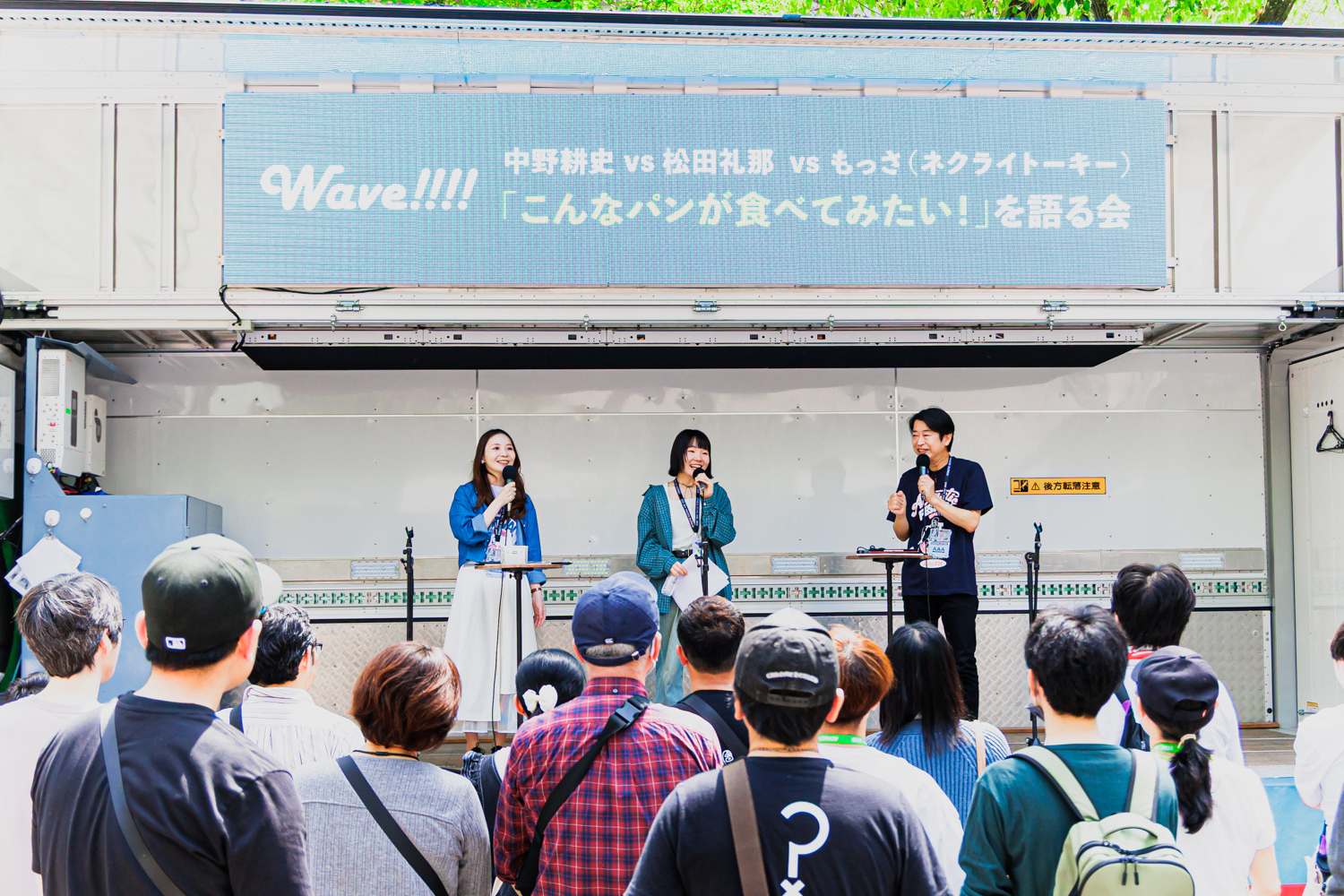 12時になり、生田神社の駐車場エリアでKiss FM KOBEの番組『Wave!!!!』の公開収録がスタートしたと同時に『アコフェス』が開幕! サウンドクルー(DJ)の中野耕史と松田礼那が「盛り上がっていきましょう!」と気合いを入れ、ネクライトーキーのもっさ(Vo.Gt)を迎えて「こんなパンが食べてみたい!」を語る会を楽しそうに展開した。