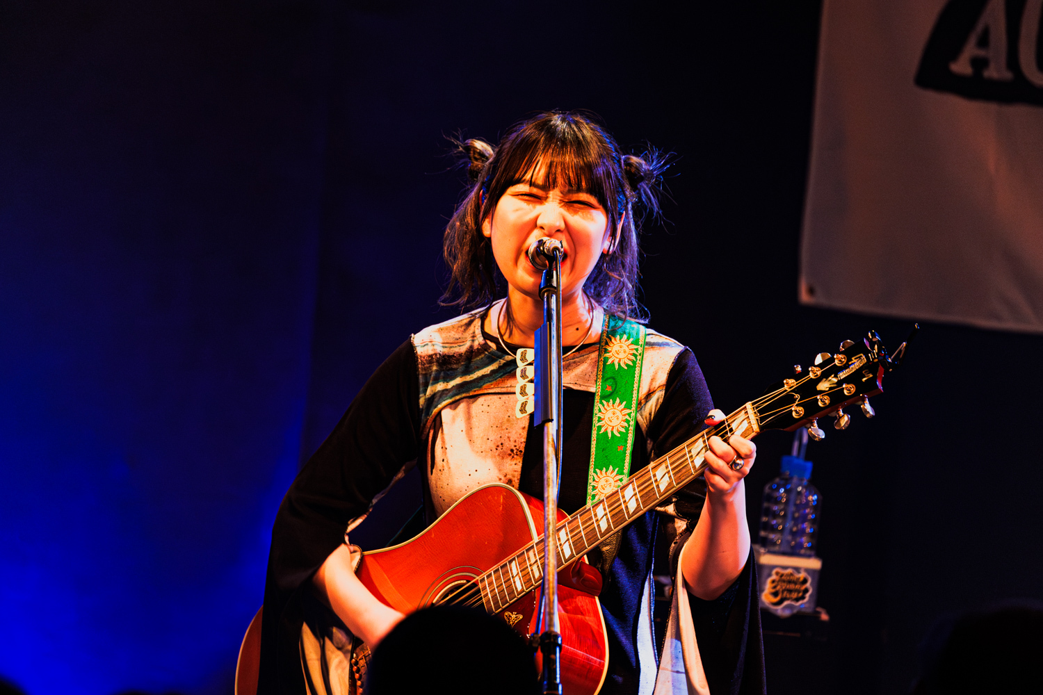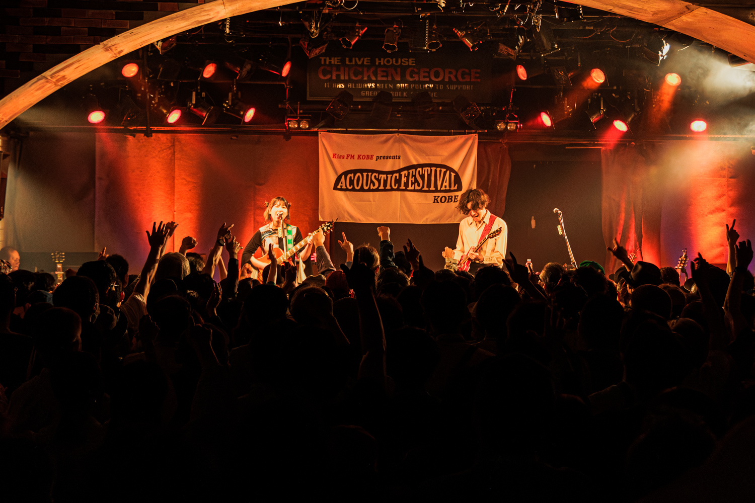 「アコースティックバージョン」といえど、圧倒的な歌唱力とブルージーなギターサウンドで、パンパンの神戸チキンジョージを熱狂に包んだのはGLIM SPANKY。松尾レミ(Vo.Gt)が「こんにちはGLIM SPANKYです! よろしく神戸!」と挨拶して「怒りをくれよ」を早速飛ばしていく。松尾はアコースティックギターを、亀本寛貴(Gt)はエレキギターを持ってパワフルなアンサンブルを放つと、フロアは歓喜の拳を上げる。『LOOKING FOR THE MAGIC Tour 2019』以来のチキンジョージということで、松尾は「ただいま!」と笑顔。亀本は2015年に『アコフェス』の前身イベント『トアロード・アコースティック・フェスティバル』にも出演したことを思い返して懐かしむ。