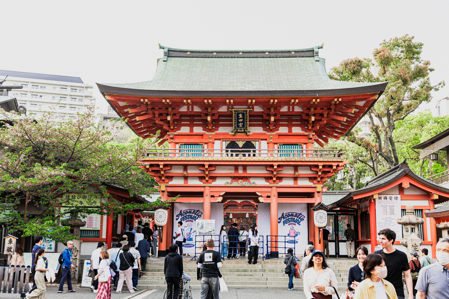 この日はとびきりの晴天が広がった。絶好の行楽日和とあって、休日の三宮はにぎやかだ。『アコフェス』のハブとなる生田神社は、神戸の地名の由来となった神社で(神様のお世話をする家・神戸(かんべ)が設置されたことに由来)、街中にありながら緑に囲まれた「都会のオアシス」として人々に愛されている。まだ少し桜の花も残る境内には、観光客や参拝客の姿も多く見られた。