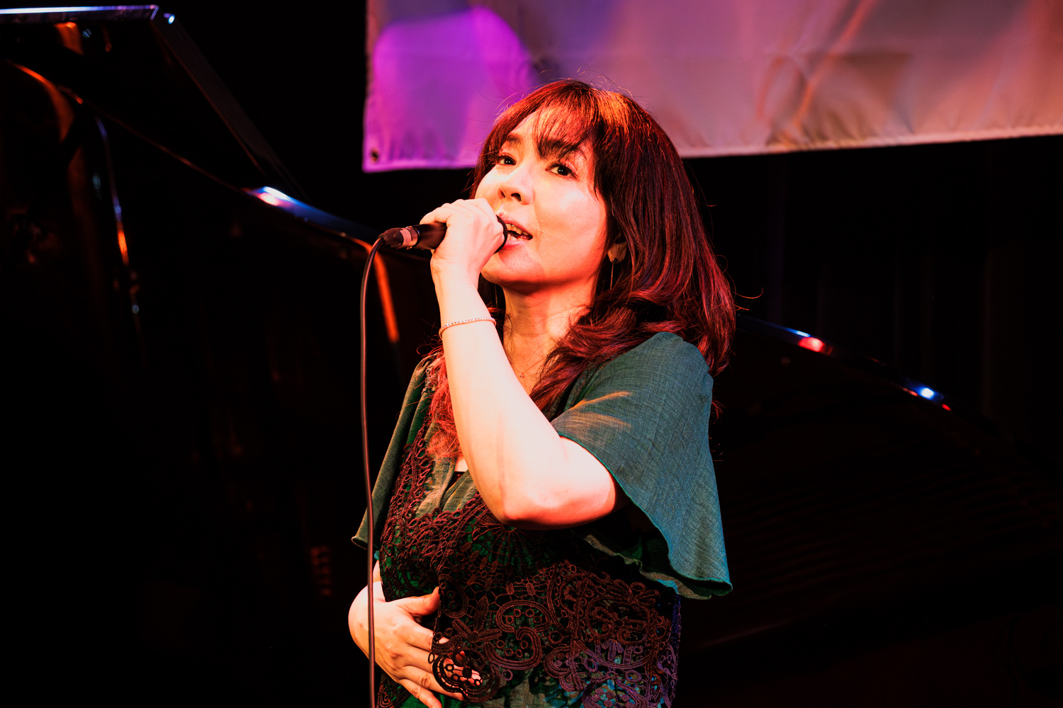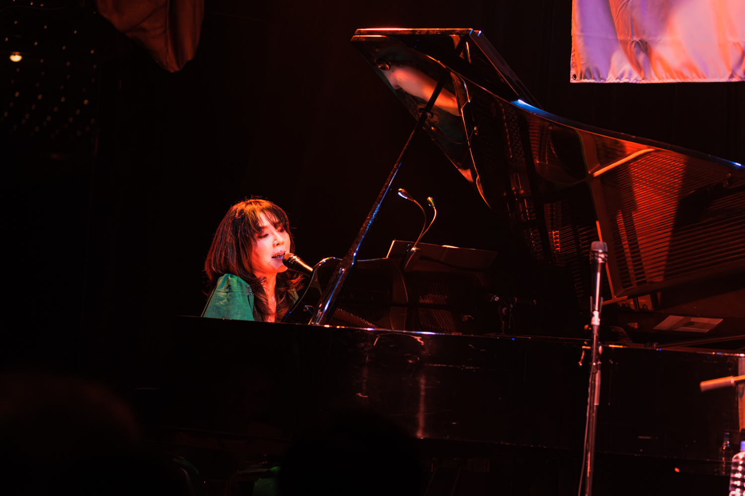 クラブ月世界を心に染み渡る歌声と優しさで包み込んだのは岡本真夜。元キャバレーの半円ステージや電飾、ベロアのソファー席は雰囲気たっぷり。グリーンの鮮やかなドレスに黒いビスチェを合わせた岡本は増崎孝司(Gt)とともにステージに立つ。岡本は「神戸も『アコフェス』も久しぶりで、とても楽しみにして来ました。少しでも皆さんの心に寄り添える瞬間があれば嬉しいなと思います」と微笑み、グランドピアノで「Alone」を弾き語り。ビブラートを多用して感情の揺れ動きを表現し、大人の歌声を響かせると、続けて「サヨナラ」を情熱的にプレイ。ピアノとギターのアンサンブルも美しく、重ねたキャリアを感じさせた。